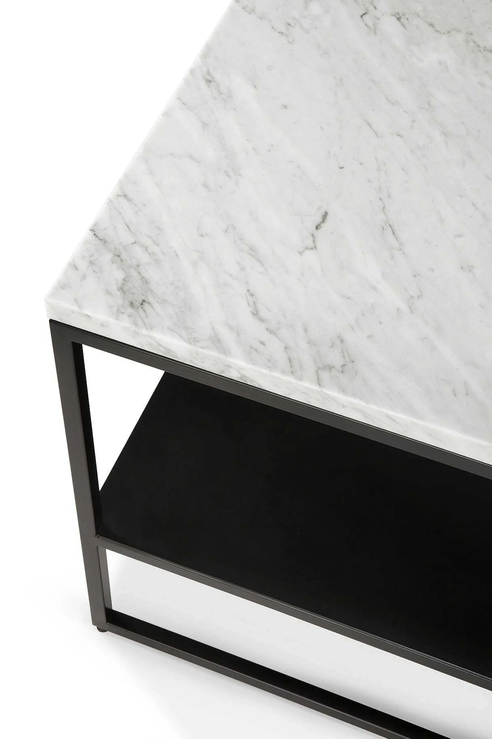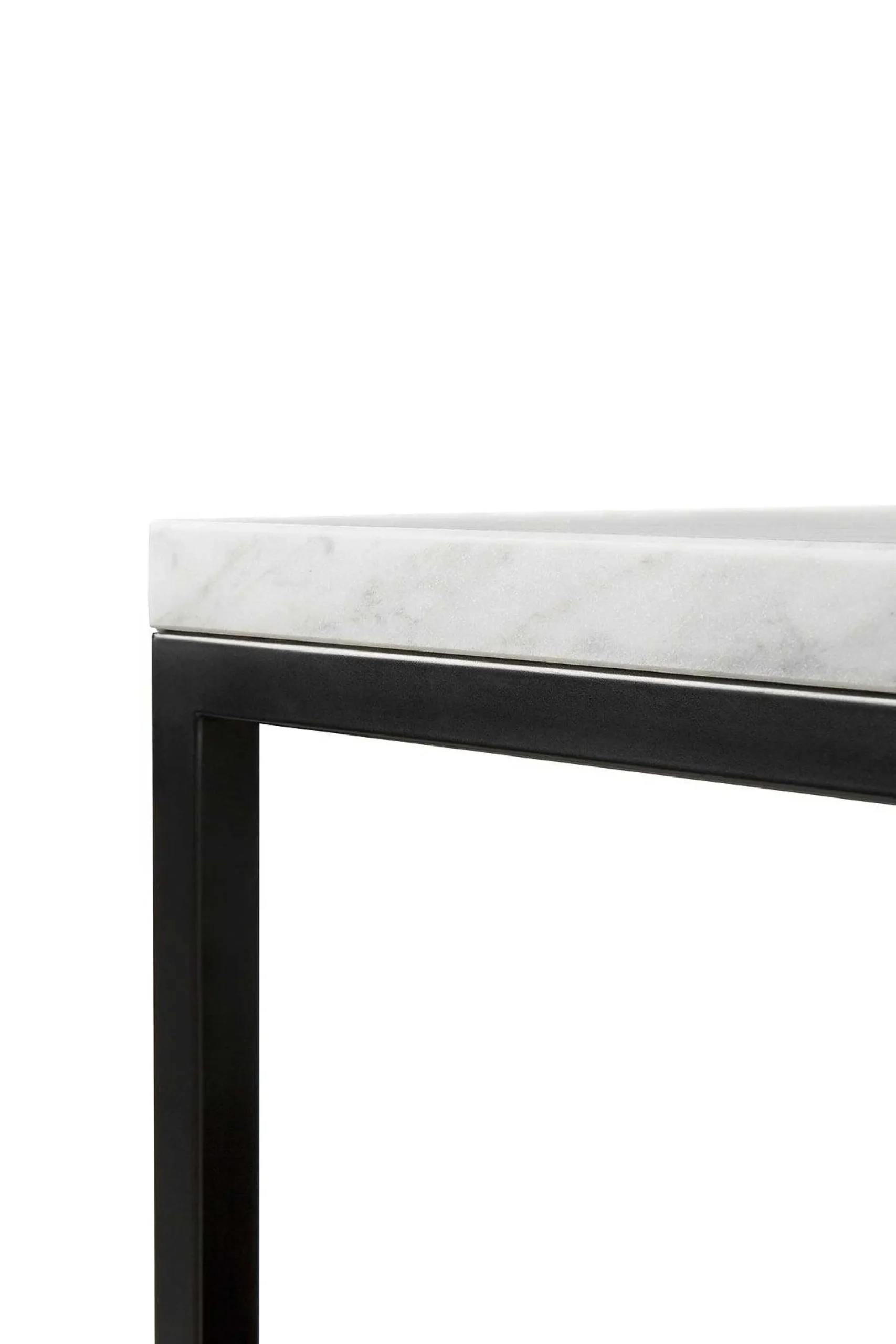 - Polished White Carrara marble top with a black metal frame.