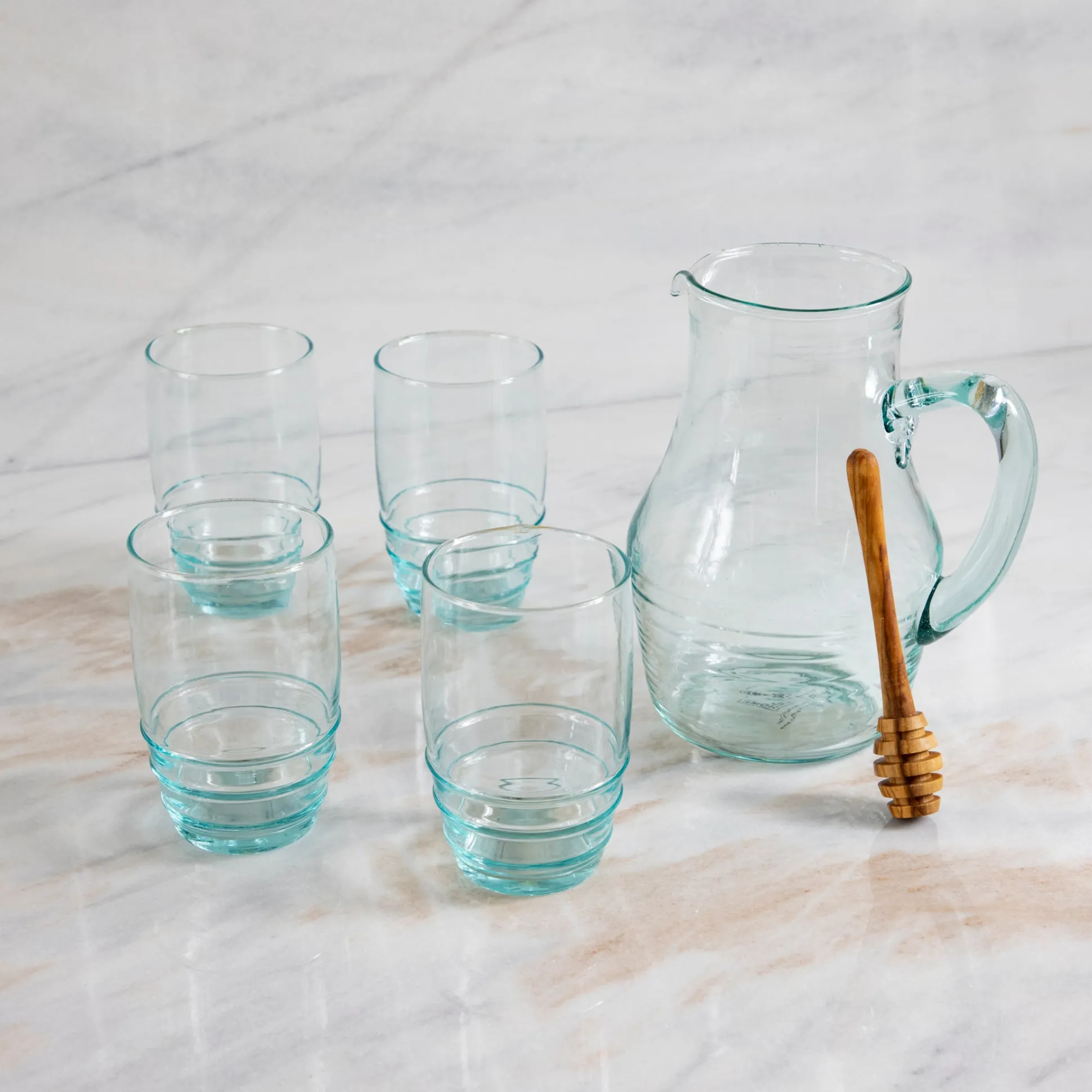 Bundle Includes: Premium Recycled Glass Rings Tumbler, Tall, Set of 4, Premium Rings Recycled Glass Pitcher, Olive Wood Honey Dip