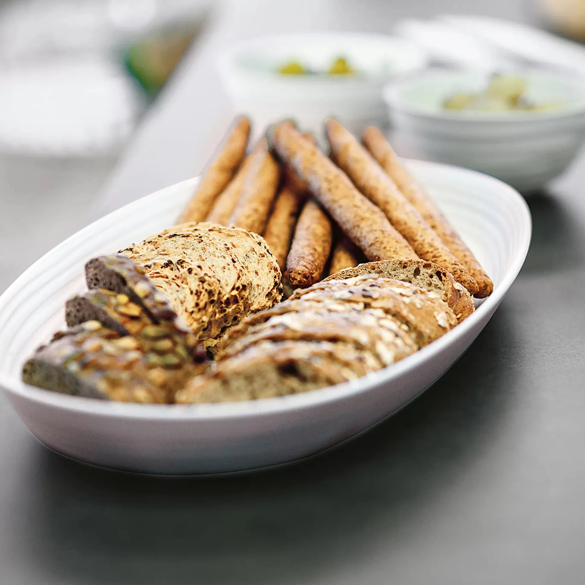 Tierra collection serving tray, made entirely by recycling 13,5 post-consumer PET water bottles, symbolizing a revolution in terms of material and style. The intentionally uneven circular decorations confer a strikingly resonant hand-made look.