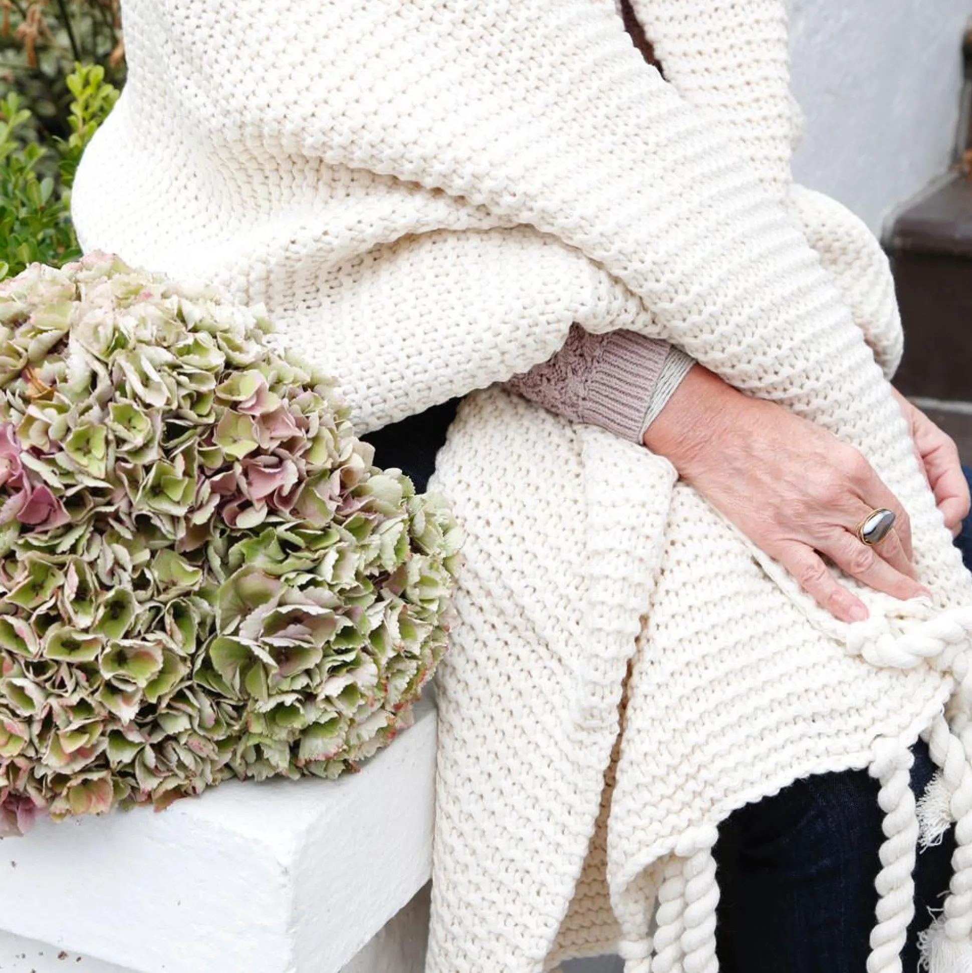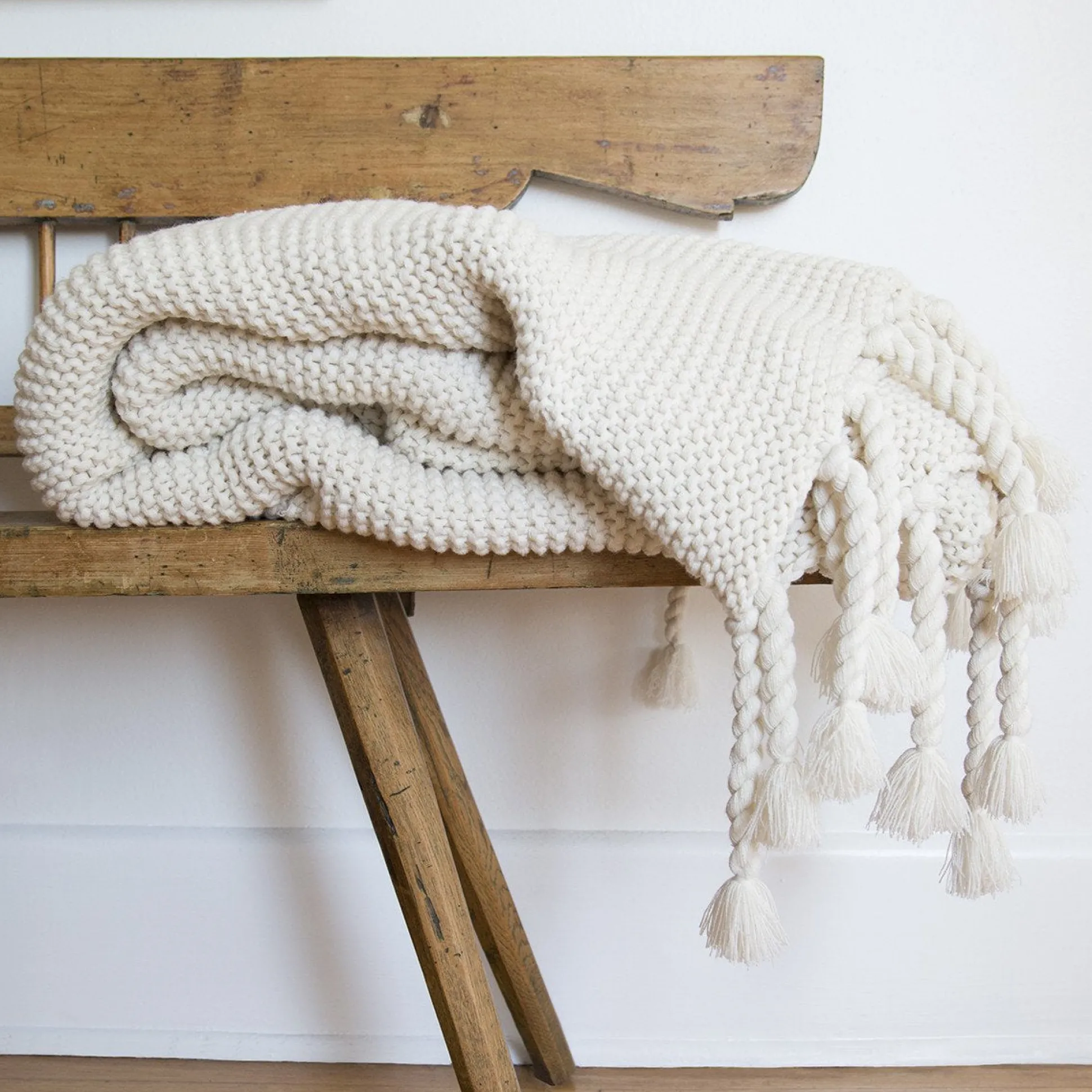 Indulge in this oversized cable-knit throw complemented with a tassel design. This is the perfect throw to wrap yourself with or dress at the foot of the bed.