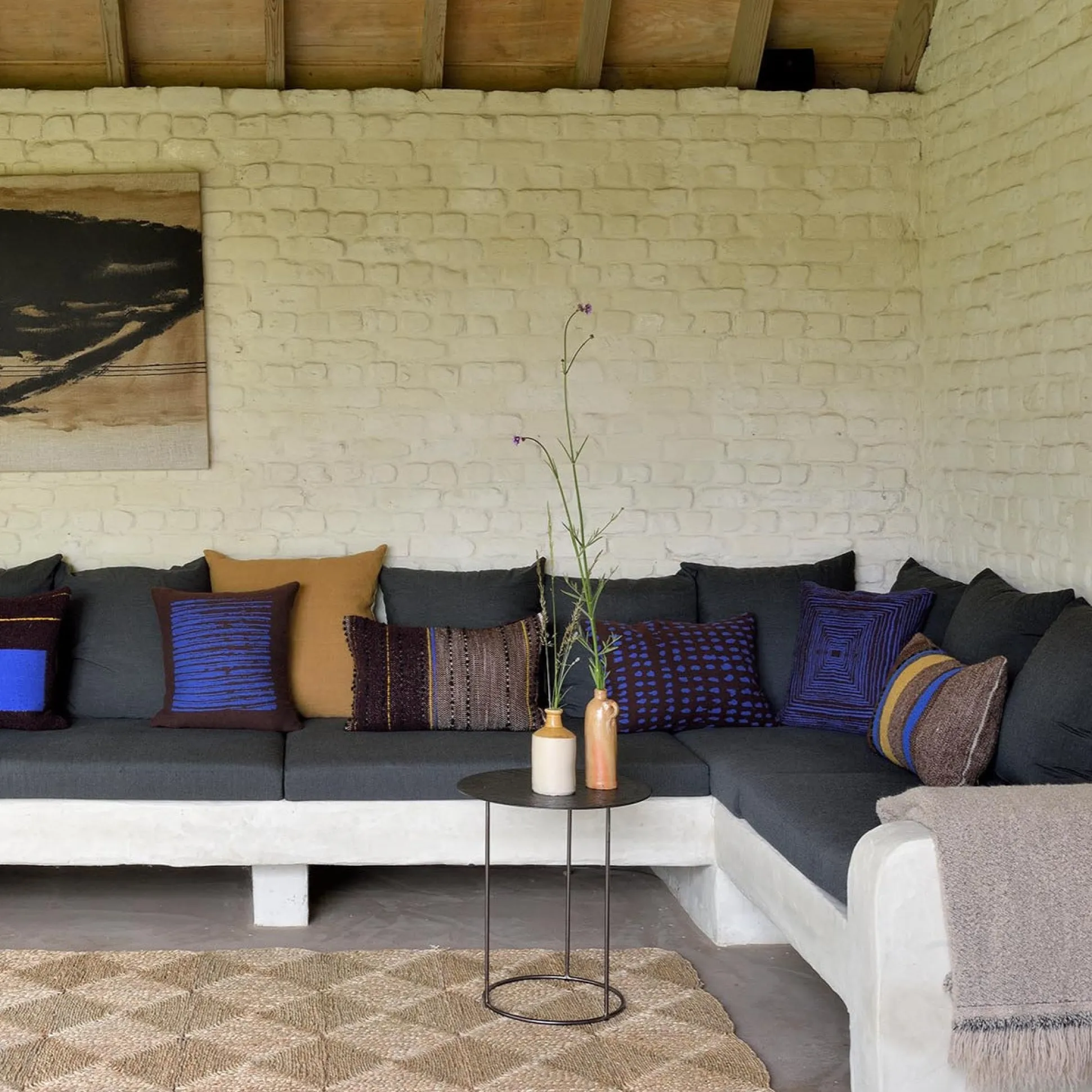 Mirroring the way ink reacts to handmade paper, painterly forms come alive woven into the cushions of the Mystic Ink collection. The intensity of the Yves Klein blue and dark chocolate perfectly plays off the classic painterly dashes, stripes and shapes. Organic vibes with a graphic edge produce a distinctive collection that perfectly complements the wider textiles range.