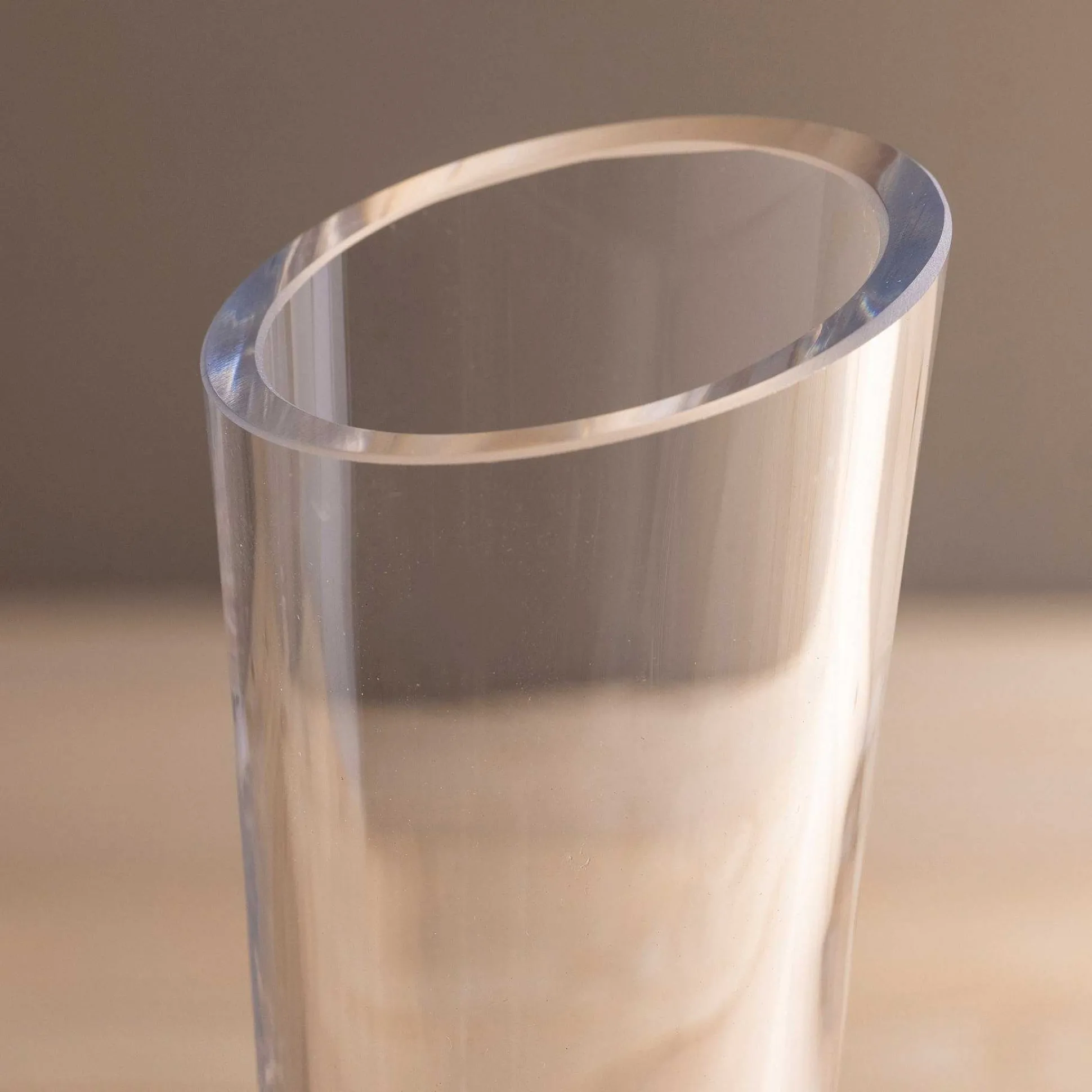A mouth-blown wine carafe with a tall neck, angled rim, and wide rounded body which arches towards the long, slightly flared neck. Finished with an angled rim for pouring.