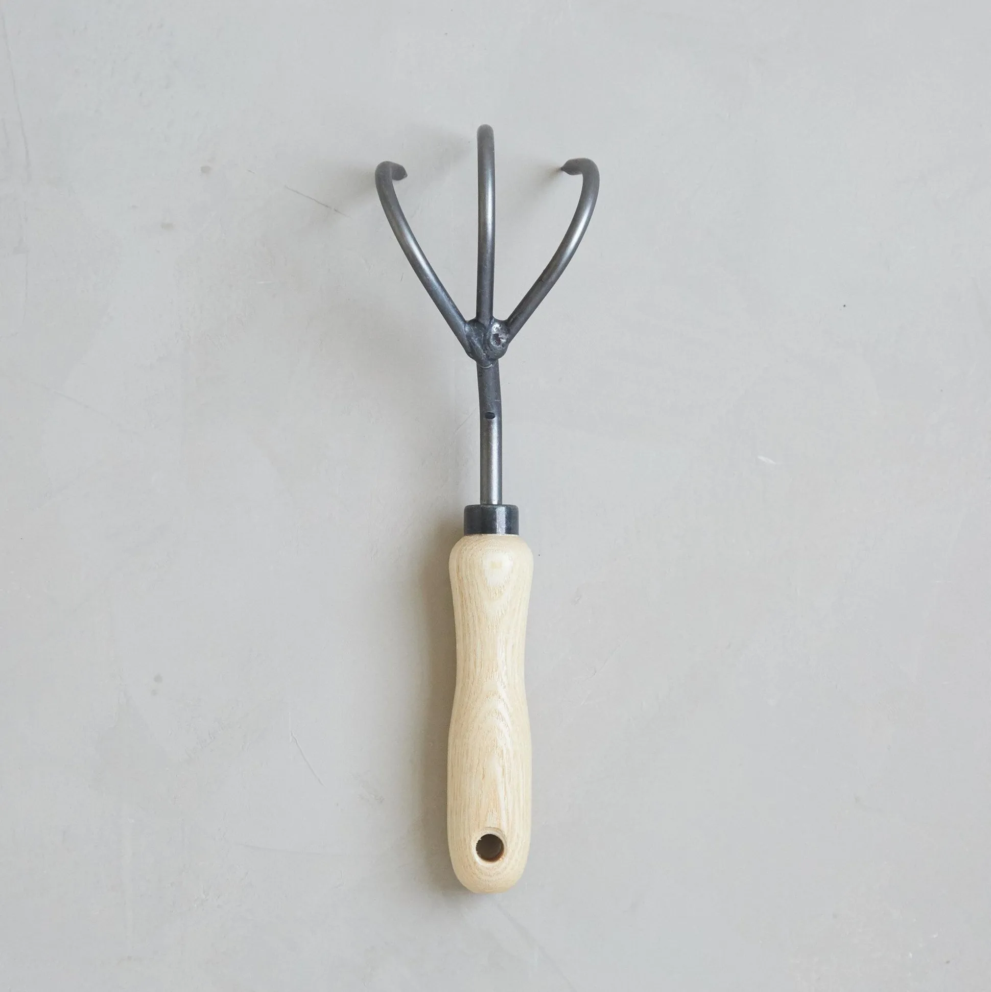 The 3-tine cultivator is made for quick aerating and cultivating jobs in hard-to-reach places. The tines are intentionally curved not to disturb the soil too much. Hand forged from durable tempered boron steel with ash hardwood handles harvested sustainably. Created with purpose and intended to be immediate heirlooms and modern artifacts to tie our everyday lives to the forest, the field, and the garden.