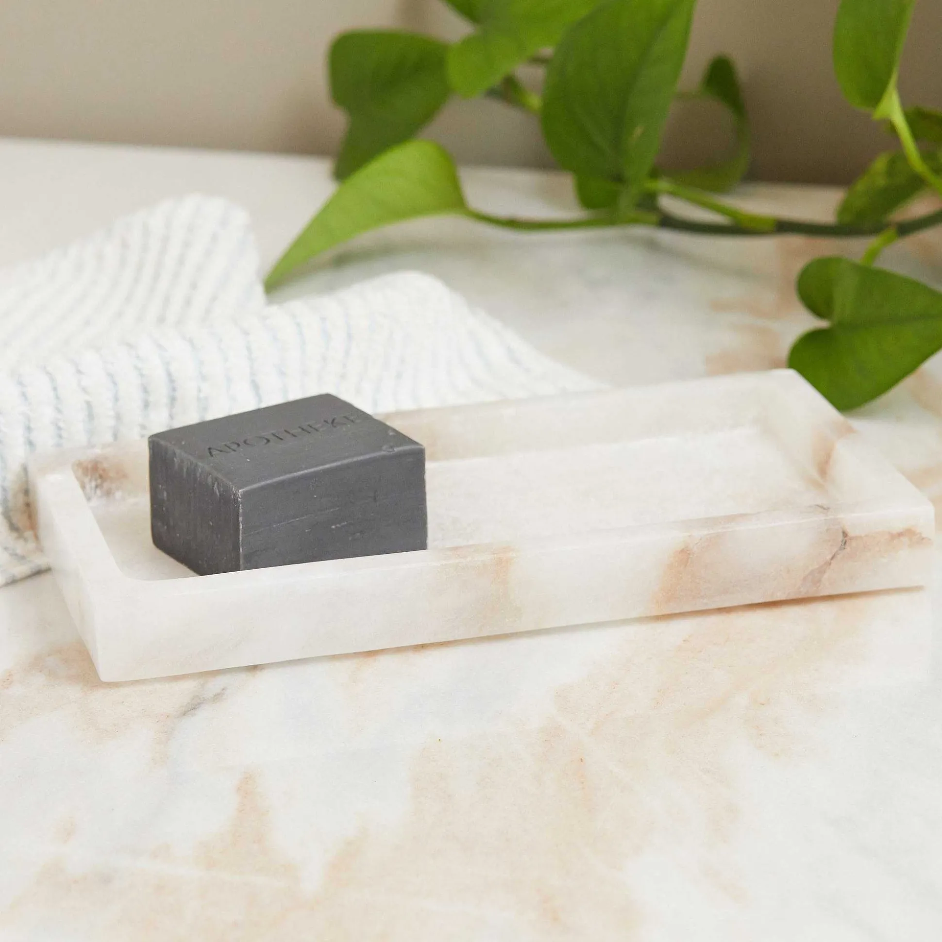 Crafted from luxuriant alabaster, the naturally marbled veining of each distinct collection piece brings artful elegance to the bathroom.