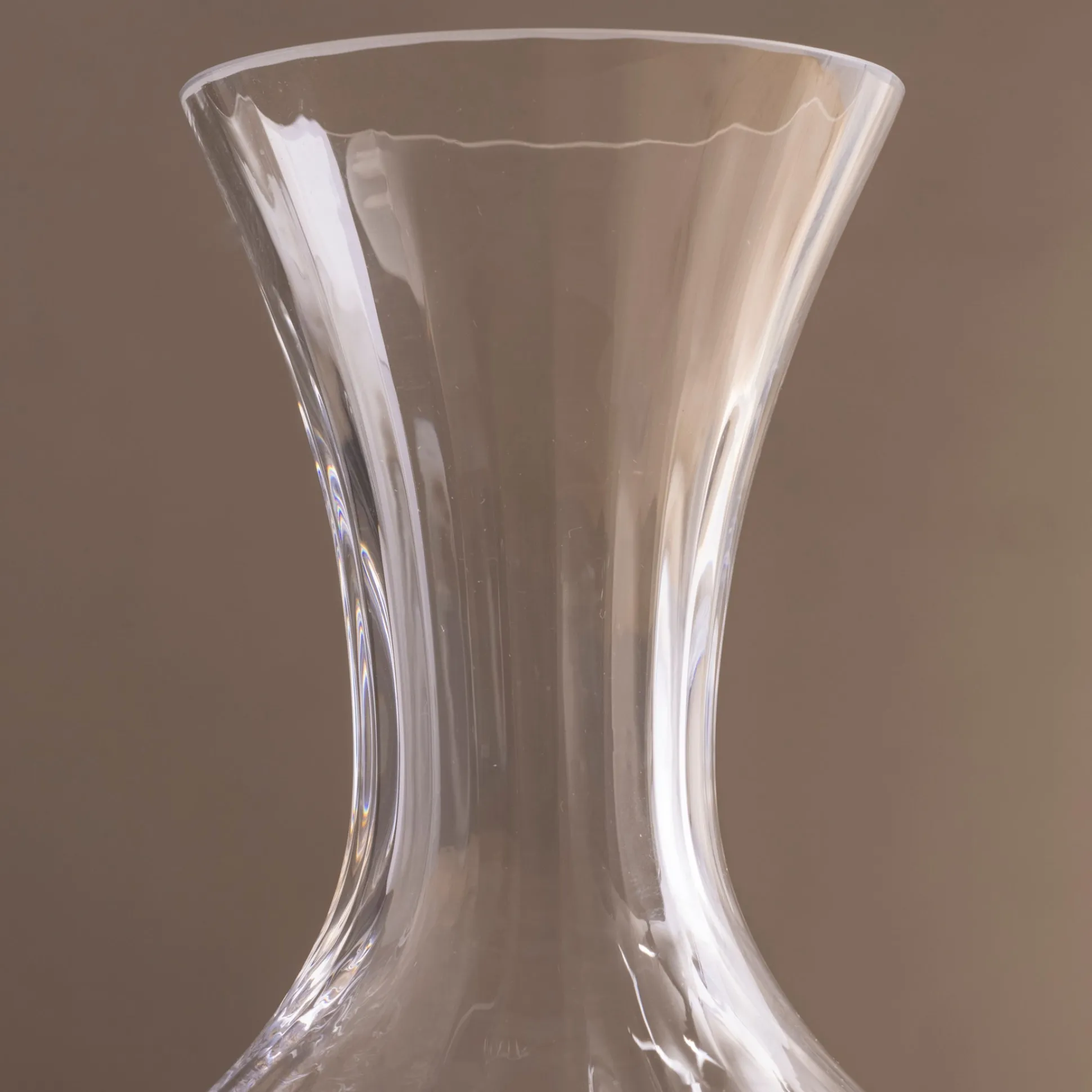 A classic wine carafe with a finely fluted finish, mouth blown by skilled glassblowers. The wide body allows for decanted wine to breathe. The subtle texture catches and reflects the light.