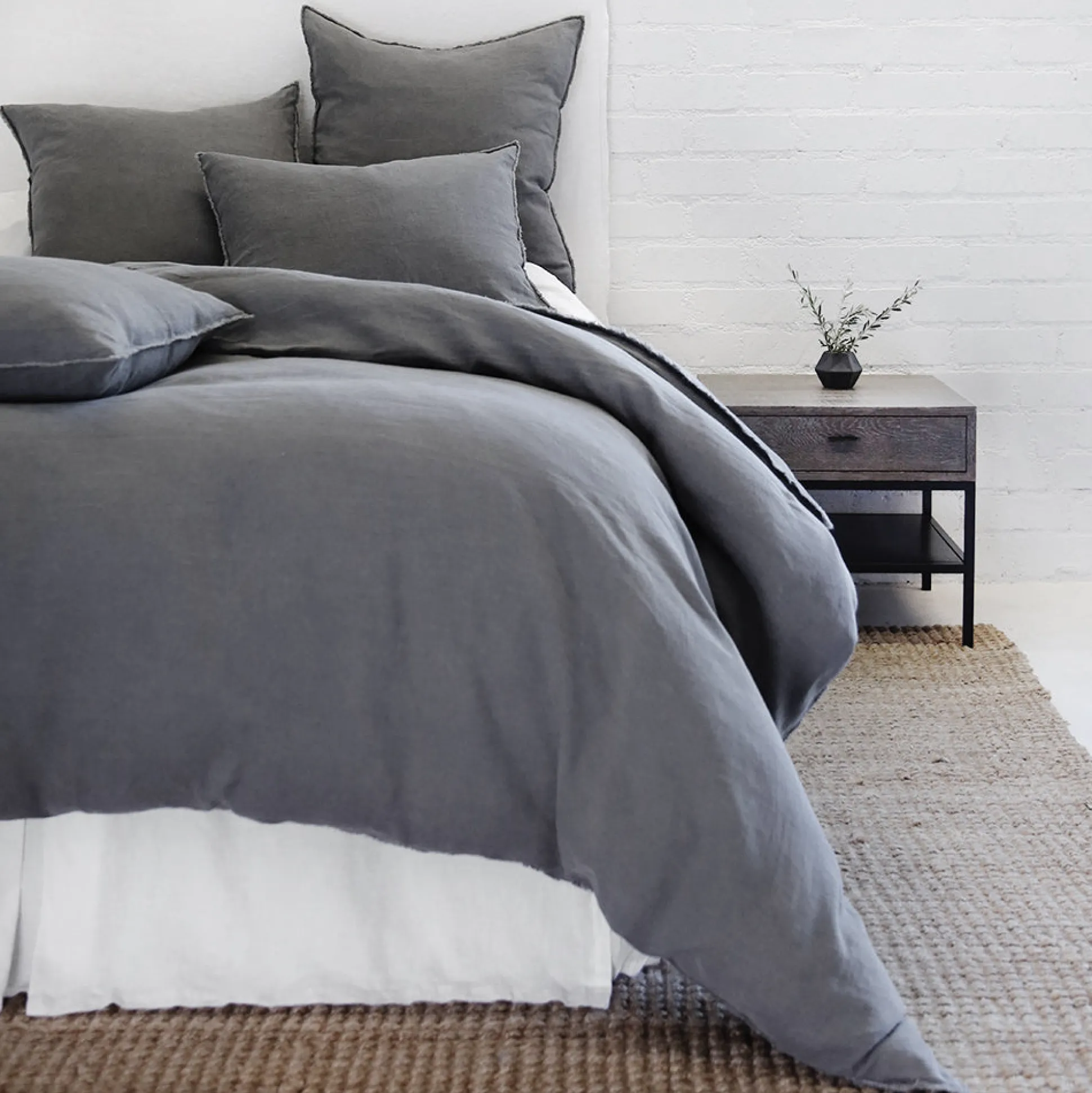 This collection is youthful and casual with subtle frayed edges. Made of 100% linen, the duvet cover and shams are finished with simple tie closures.