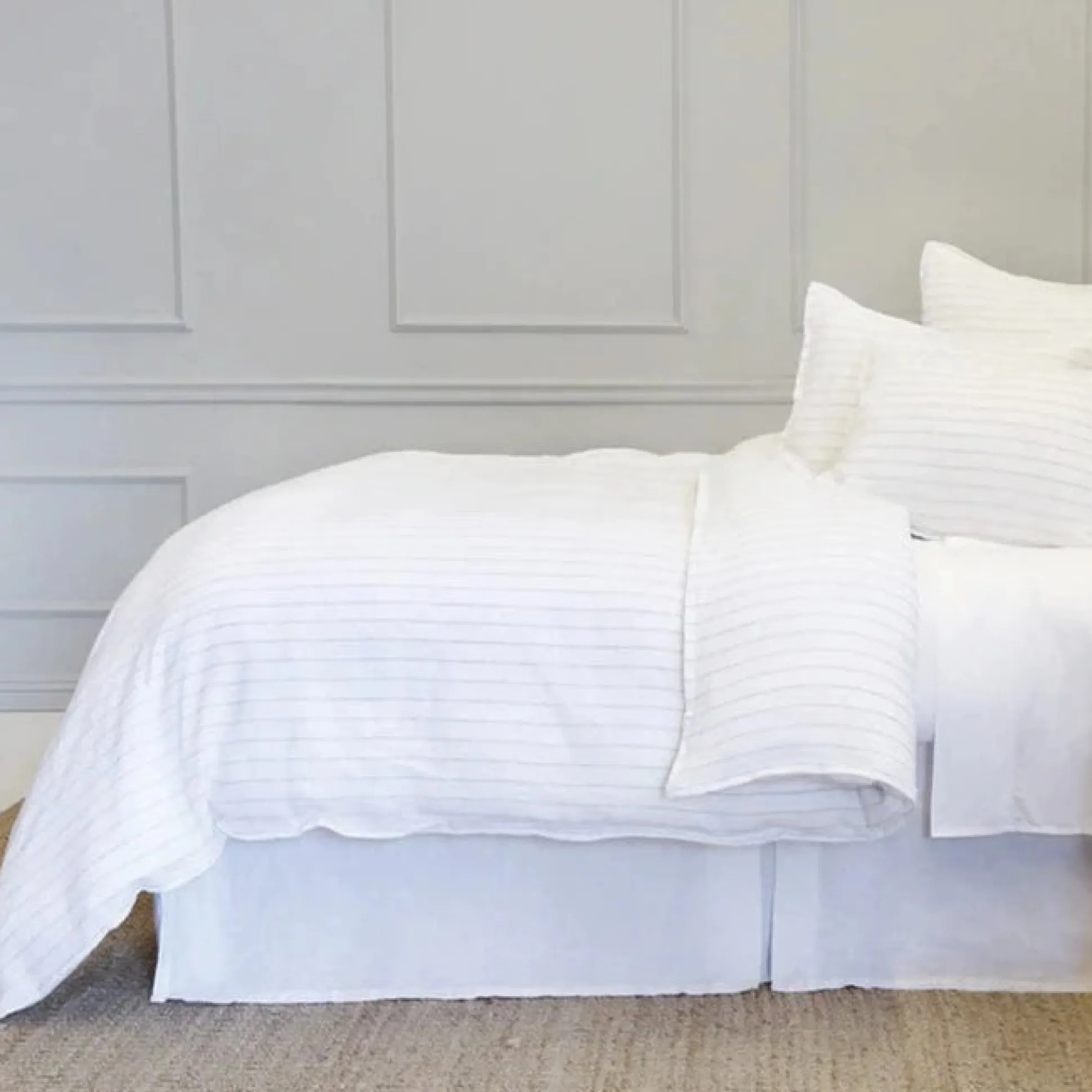Our Blake Collection features an interwoven stripe texture, giving a modern refresh to a traditional stripe. Our duvet cover and shams are hand-loomed by artisans and the linen is washed for a relaxed lived-in look. The mélange of textures within this woven bedding elevates your space into a sophisticated, yet relaxing retreat.