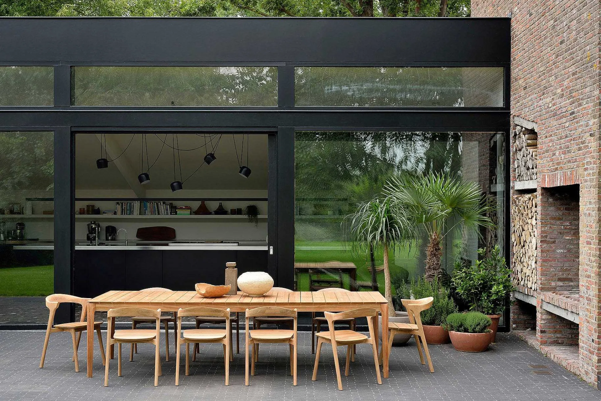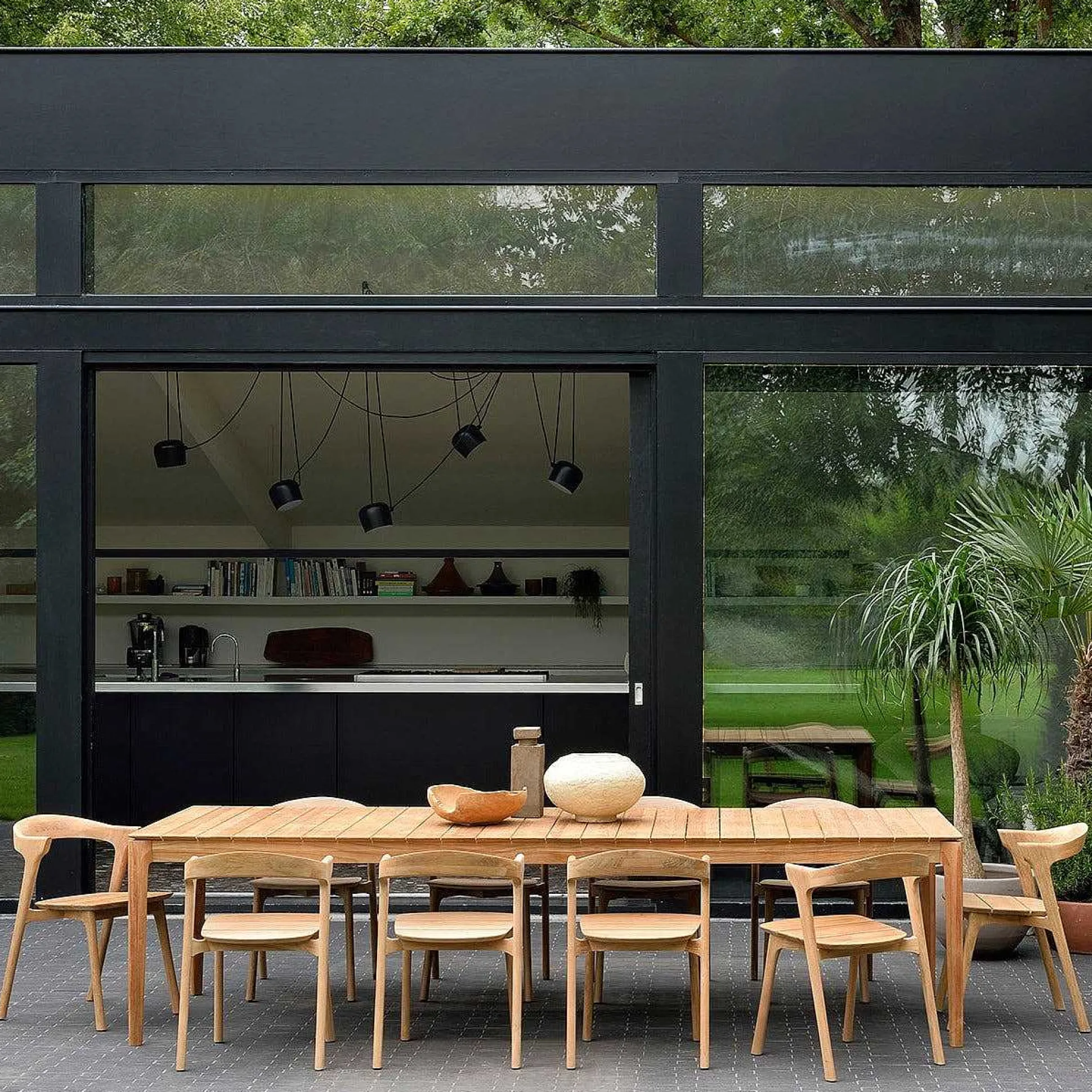 The Bok collection combines sculptural elegance and contemporary crafting into a graceful and airy form. Just like its matching chair, the Bok dining table is another signature design. Its airy shape yet rock-solid construction make this piece a timeless and remarkable design to enjoy for all the years to come, while the adapted grooved tabletop in solid teak makes outdoor life a simple pleasure.