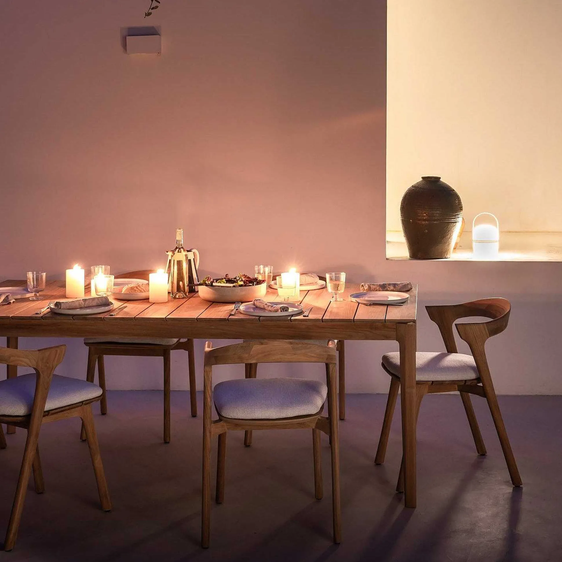 The Bok collection combines sculptural elegance and contemporary crafting into a graceful and airy form. Just like its matching chair, the Bok dining table is another signature design. Its airy shape yet rock-solid construction make this piece a timeless and remarkable design to enjoy for all the years to come, while the adapted grooved tabletop in solid teak makes outdoor life a simple pleasure.
