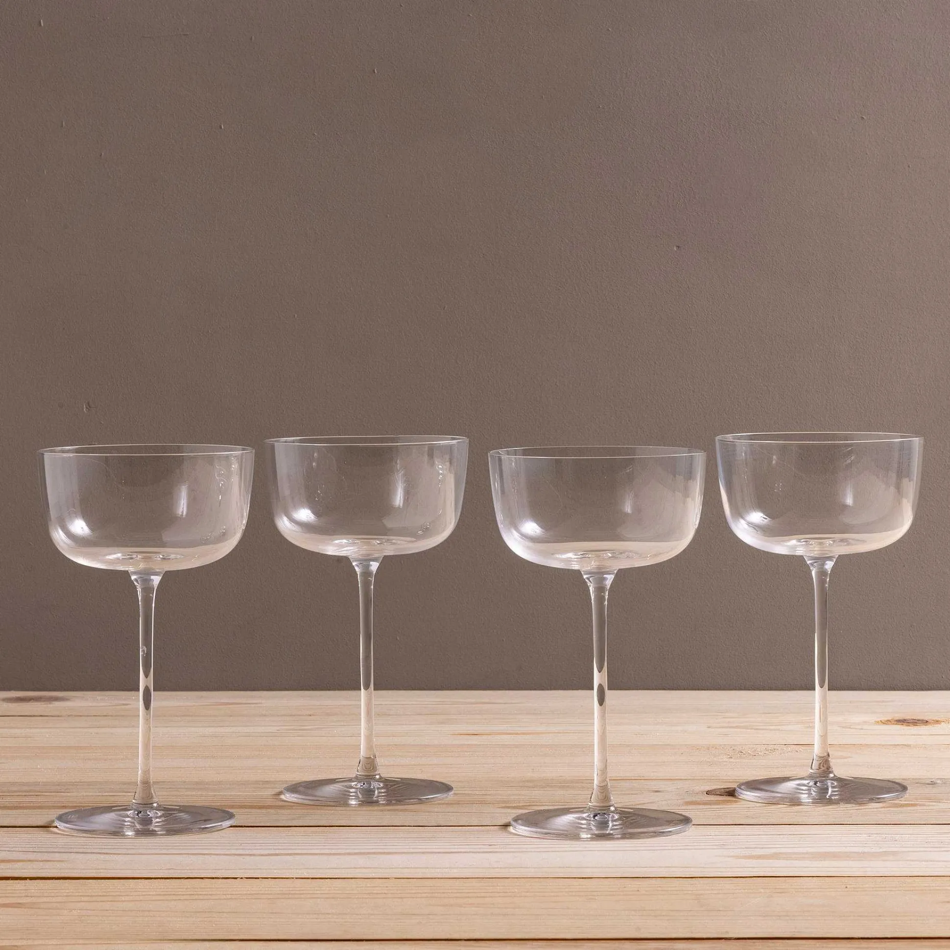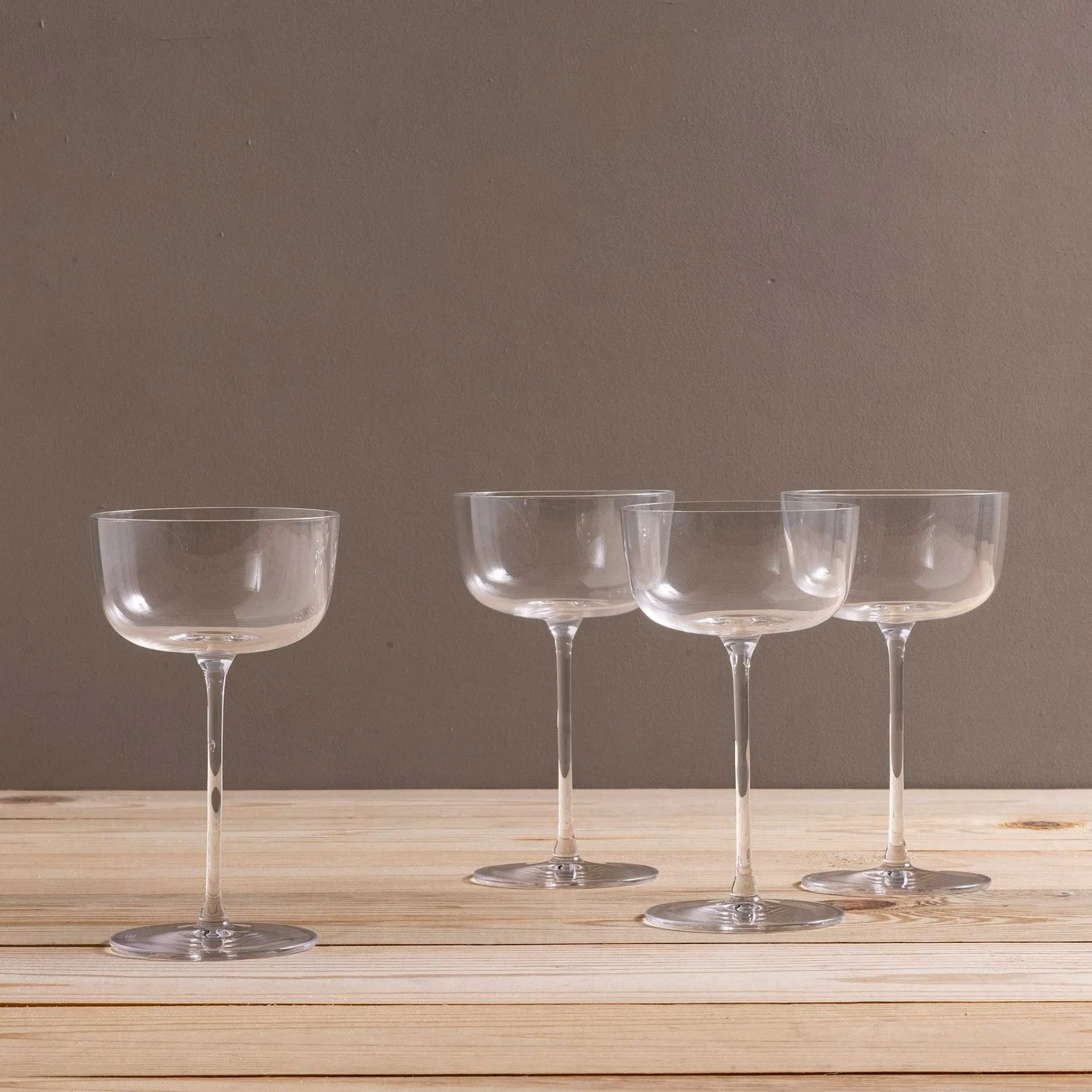 Set of four modern cocktail saucers with wide, flared bowls, fine straight stems and flat, level-planed feet. Designed for martini cocktails or champagne.