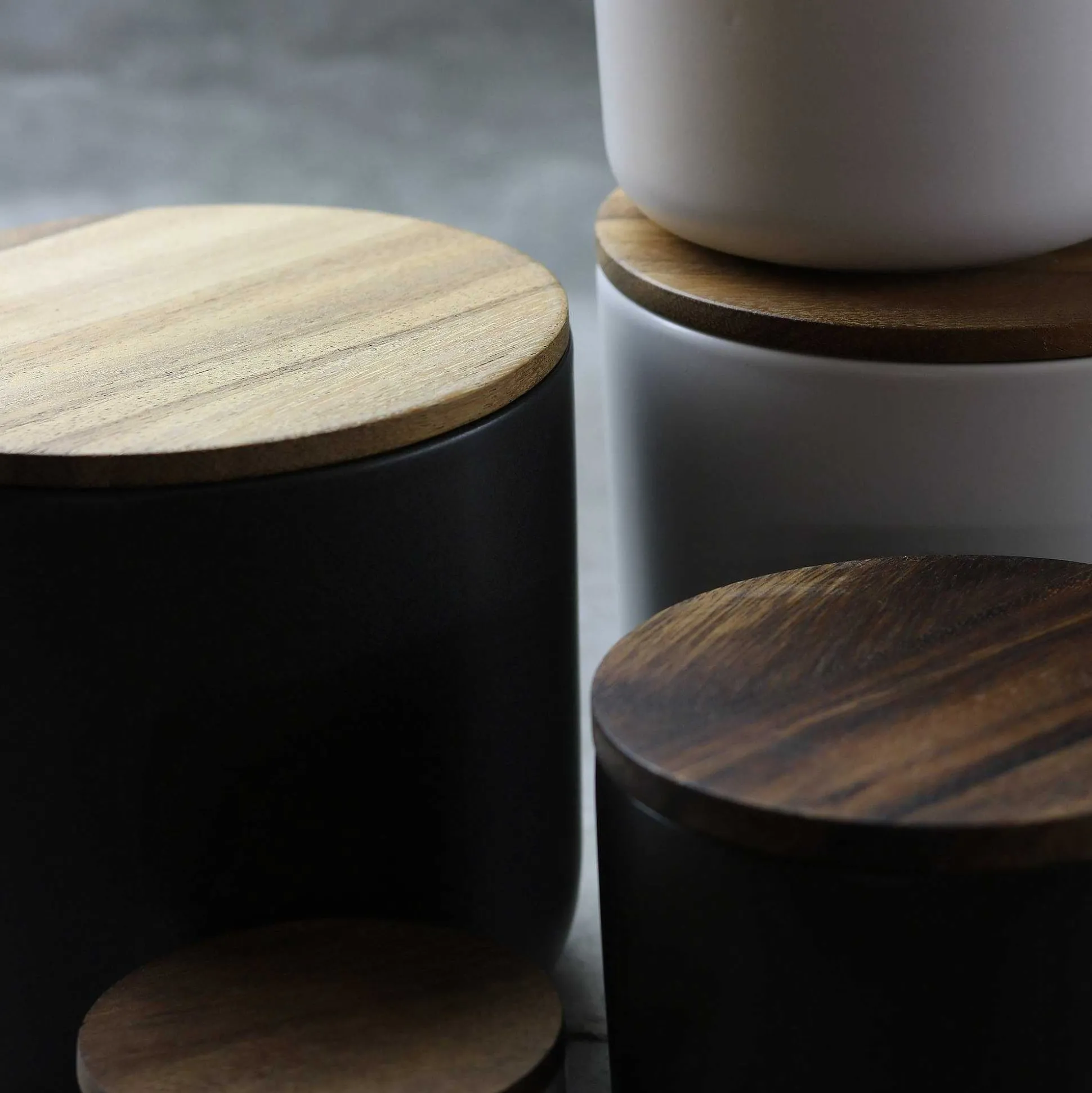 Store your goods in style with these large Stoneware canisters, accented with an Acacia Wood lid to keep your items fresh. Compact stoneware pieces are perfect as a feature in your kitchen, keeping anything from pasta and grains to your favorite sweet snacks, even fuzzy cotton balls in the bathroom.