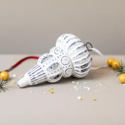 These holiday baubles look as if they’ve been dusted with the season’s first snow. Made of mouth blown glass (with 15% recycled content), these substantial ornaments are the antidote to cheap lightweight plastic. The textures and hand applied whitewash give each piece its own unique look.