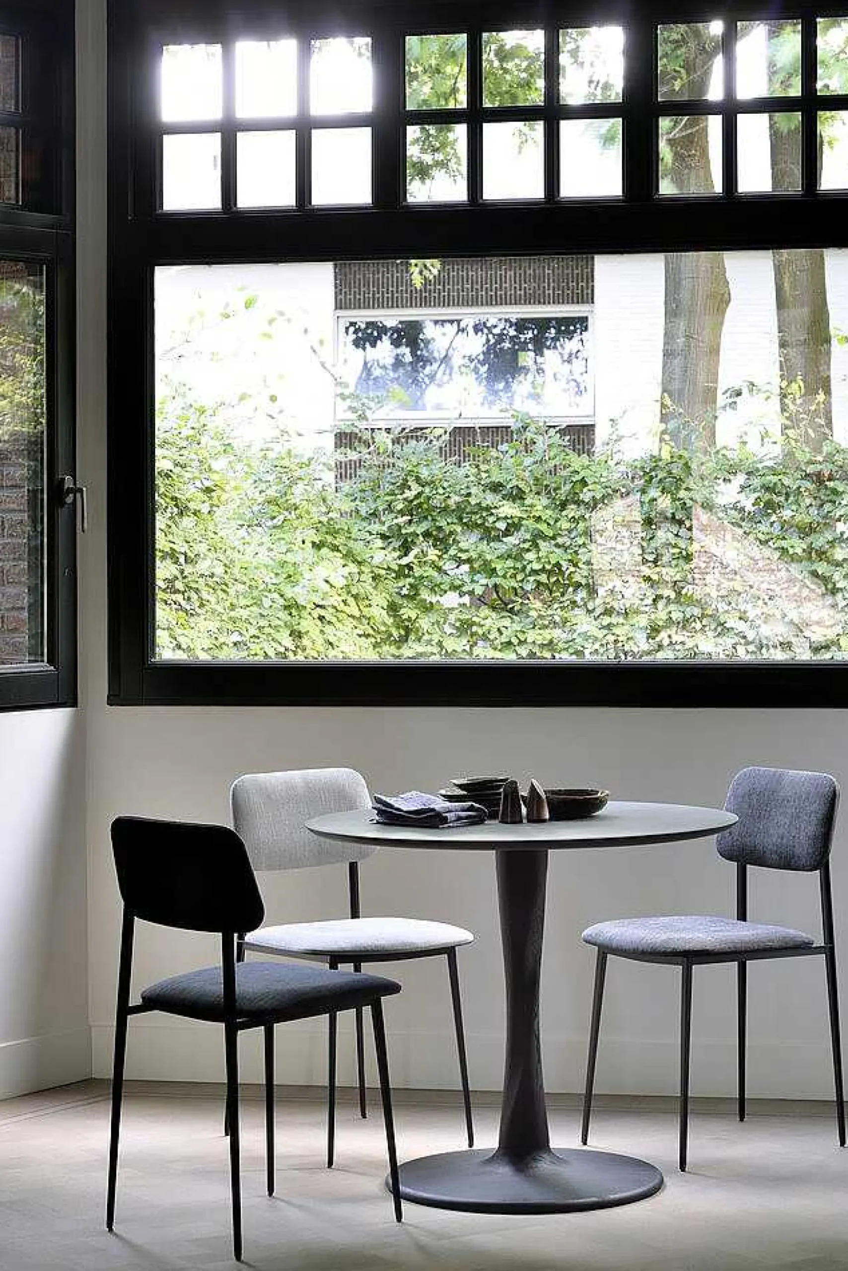An airy and angular metal silhouette forms the basis of this minimalistic design. A balance between solidity and softness creates an elegant and comfortable dining chair that will fit in any interior.