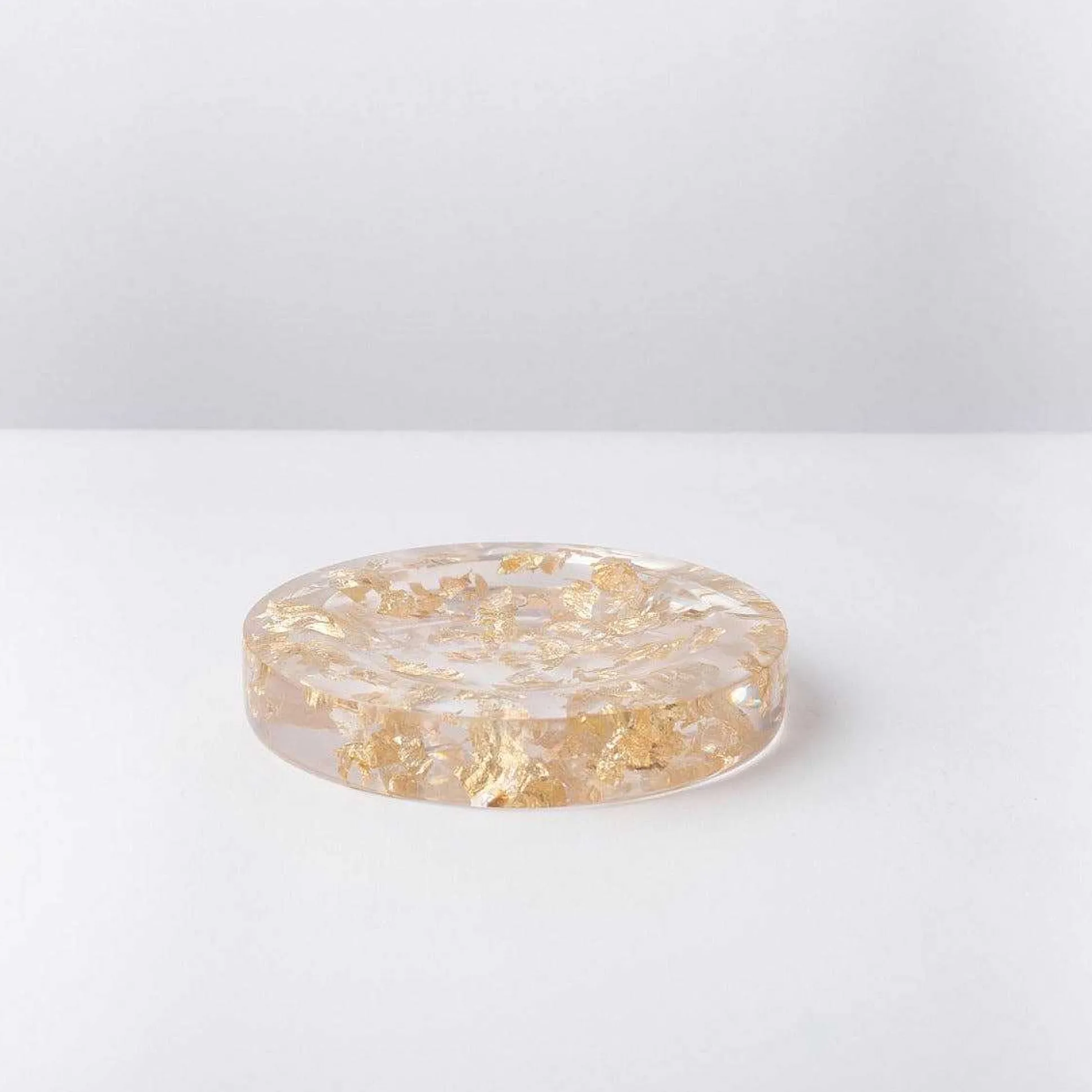 A glamorous catch all made of gold leaf encased in crystal resin. A perfect jewelry dish. Pairs seamlessly with the our Dorado boxes.