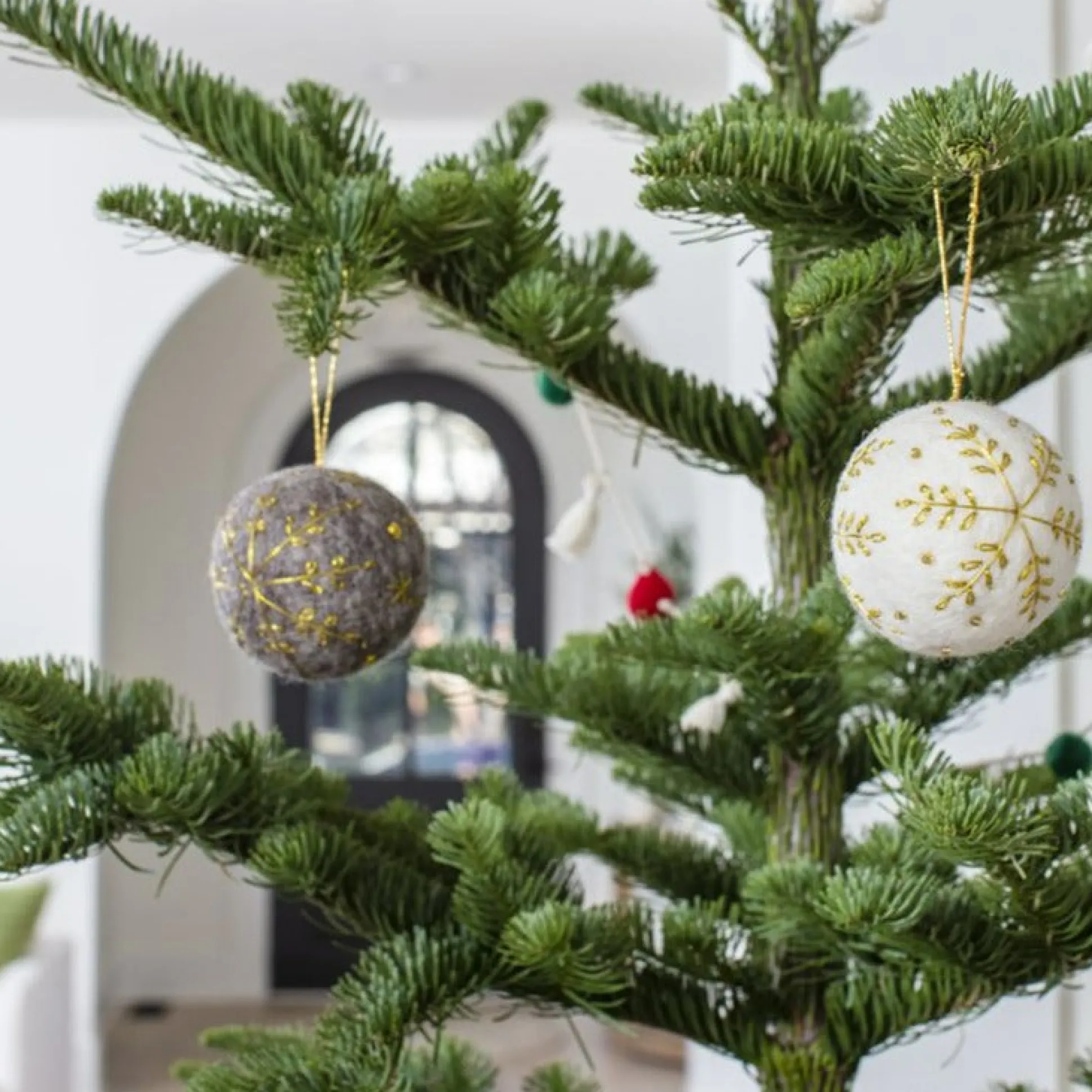 Gleaming gold snowflakes and dainty dotted accents decorate the sumptuous Eria Ornament, bringing a touch of festive grandeur to holiday decorations with Scandi style flair. Resting on a creamy felt base, the scintillating stitchery oozes sophistication and glitters enticingly in the luminous light of Christmas tree lights.