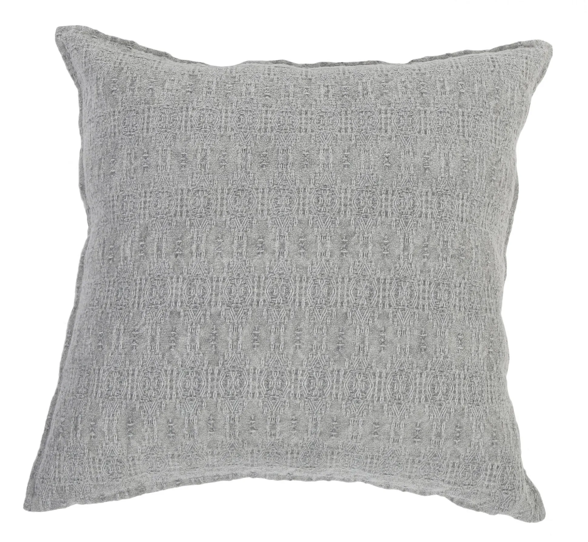 A soft velvet square pillow with a geometric embroidered pattern on the front.