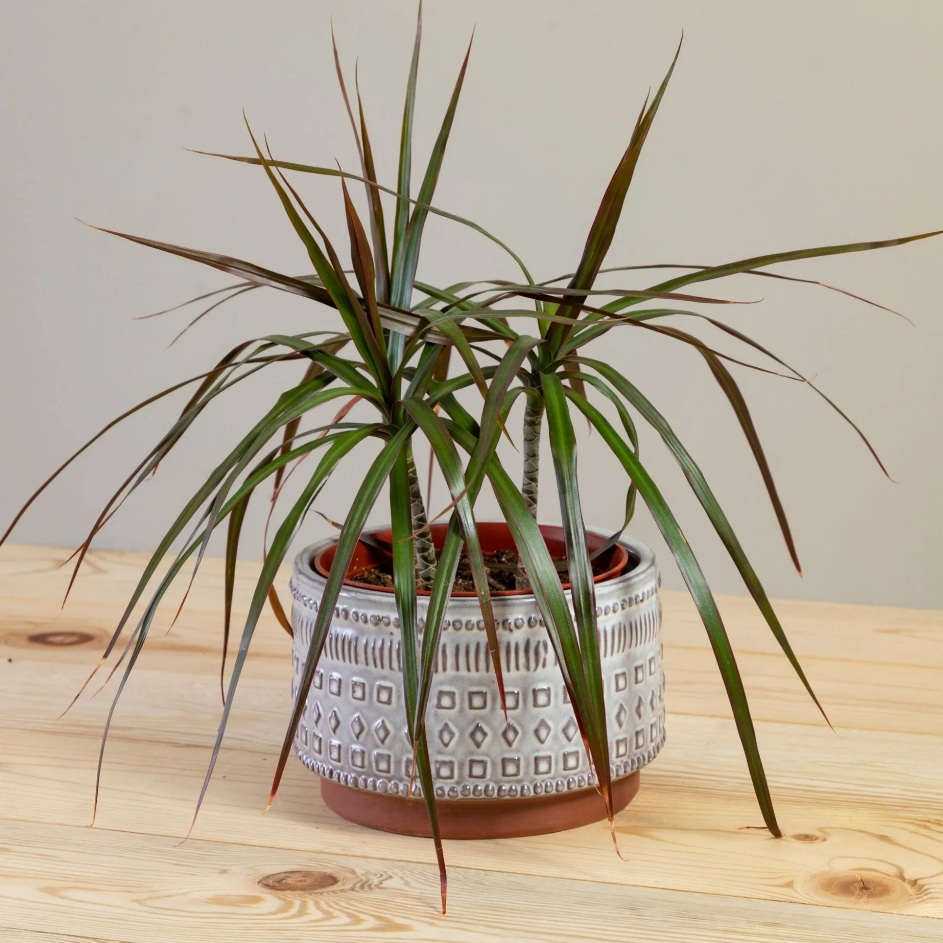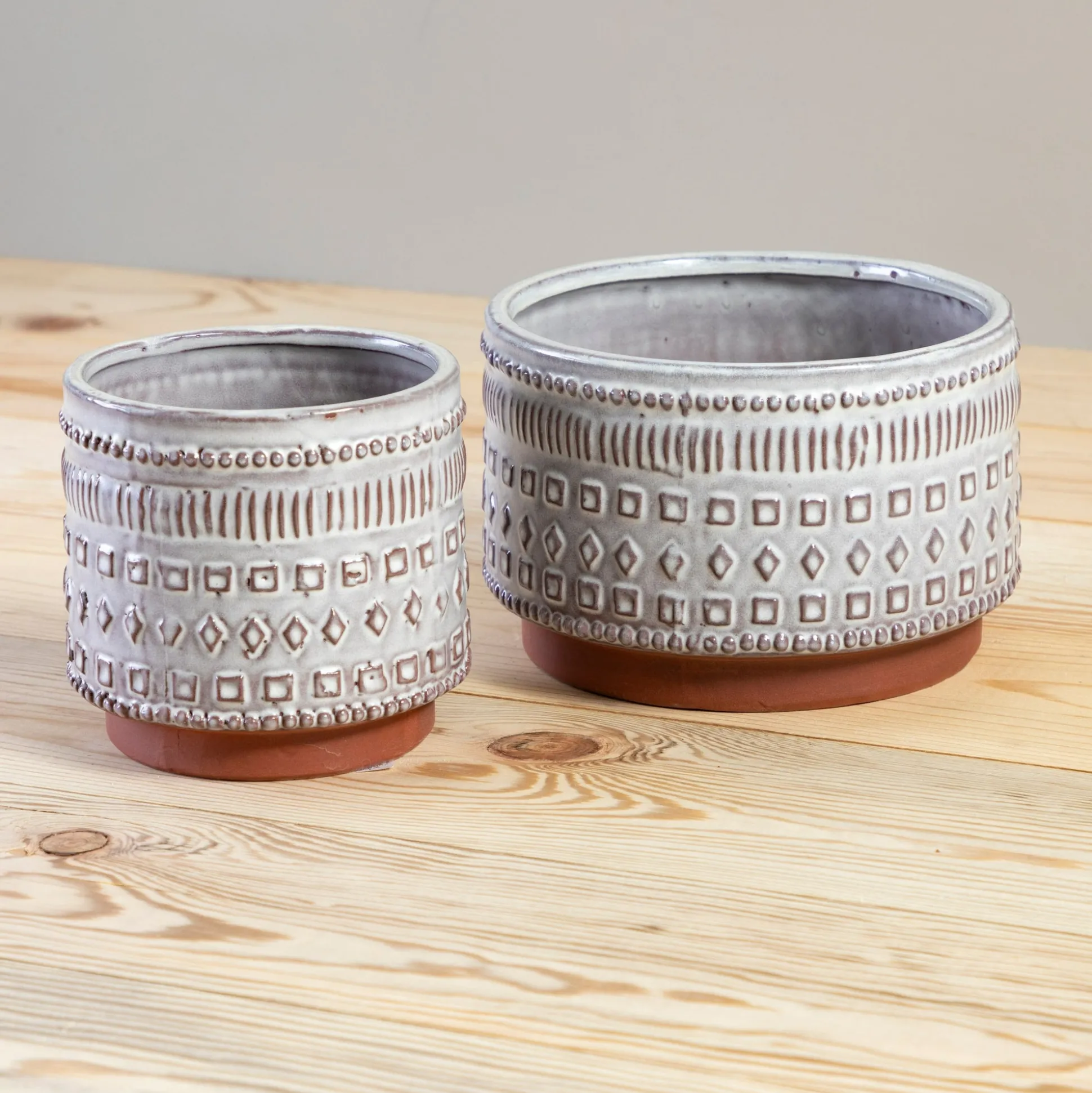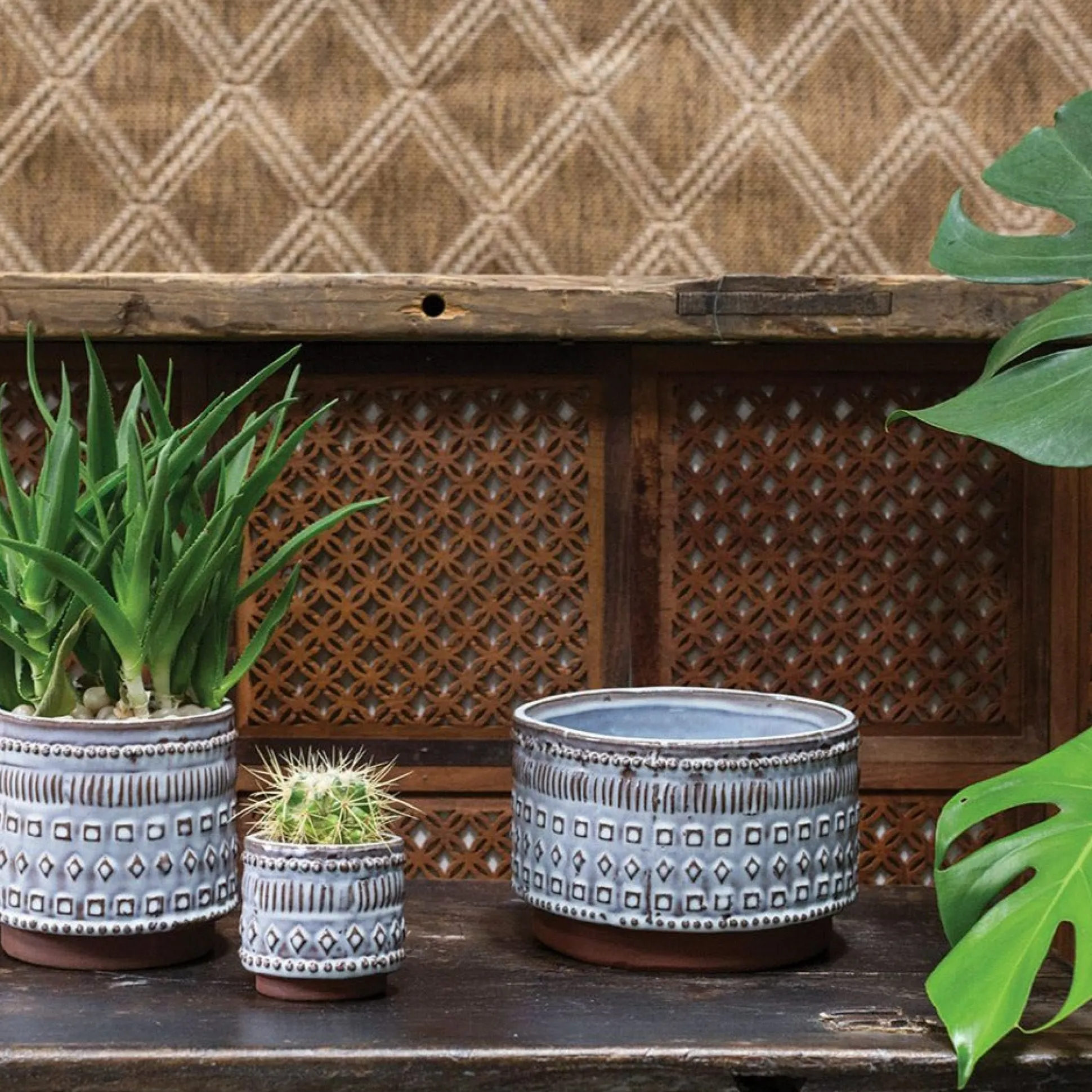 The Freja Pot is cast ceramic with reactive glaze finish and textured pattern on a red clay base for a two-toned design.