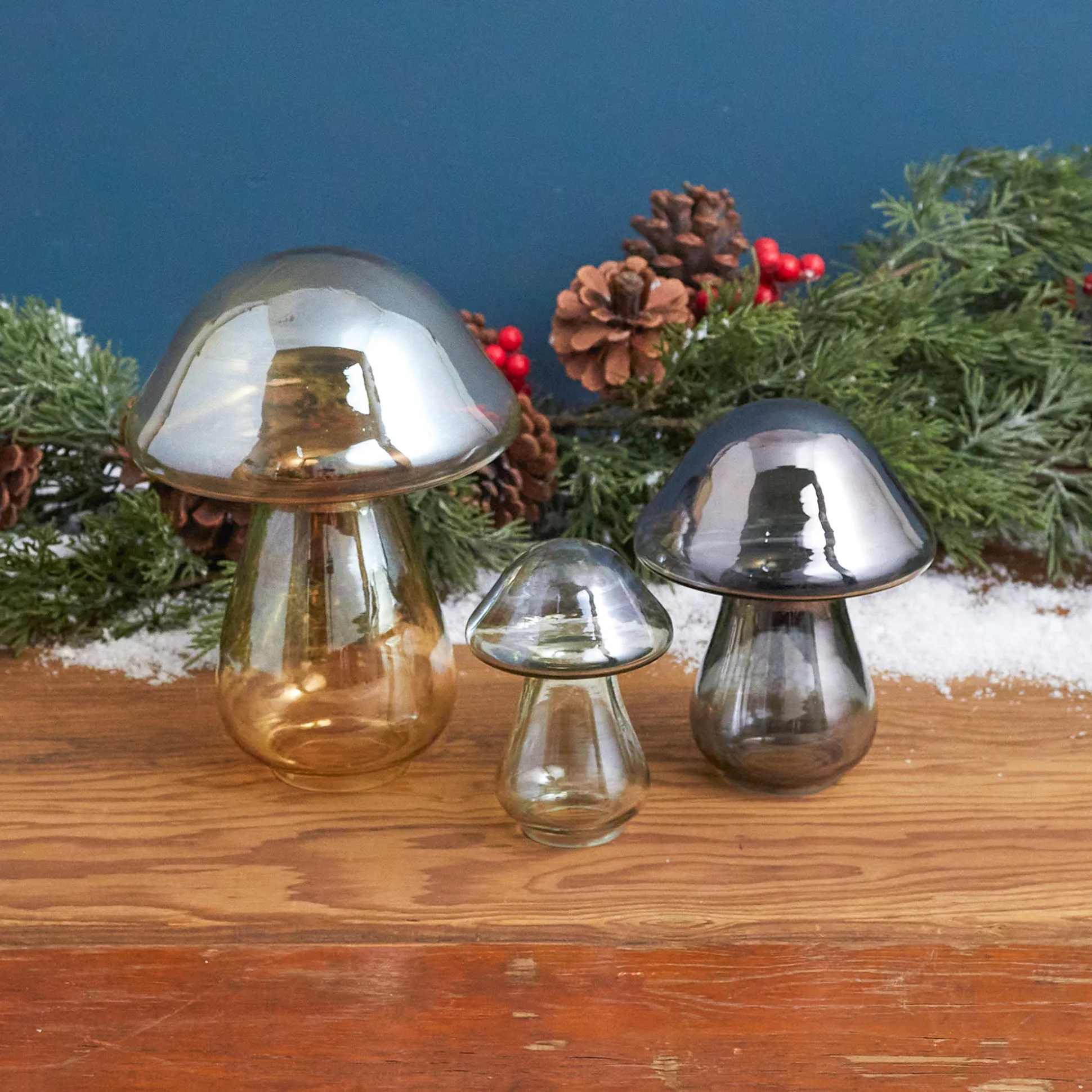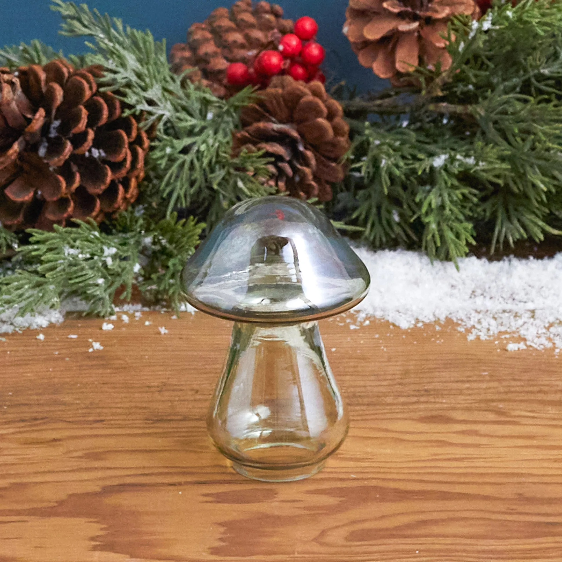 Be enchanted by the subtle colors of this enchanting small green luster glass mushroom. Its whimsical design and holiday hues make it the perfect festive decor accessory to bring a touch of festive cheer and subtle sophistication to any interior.