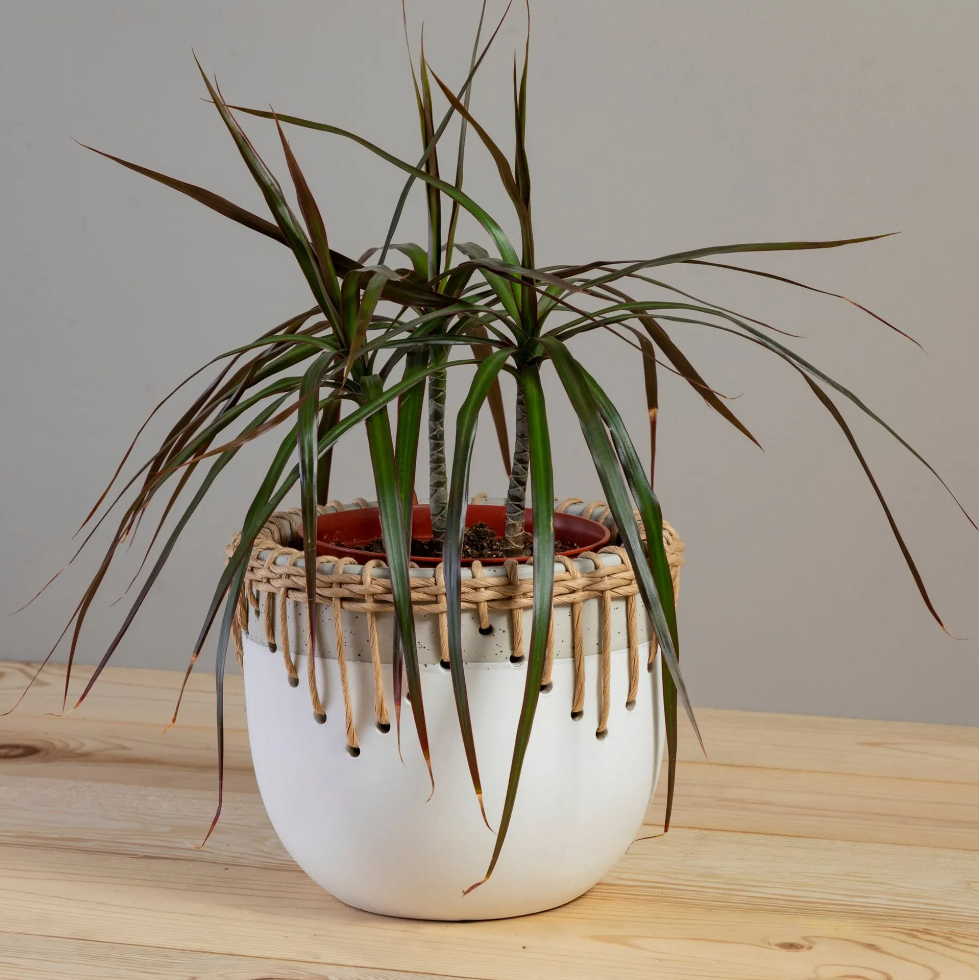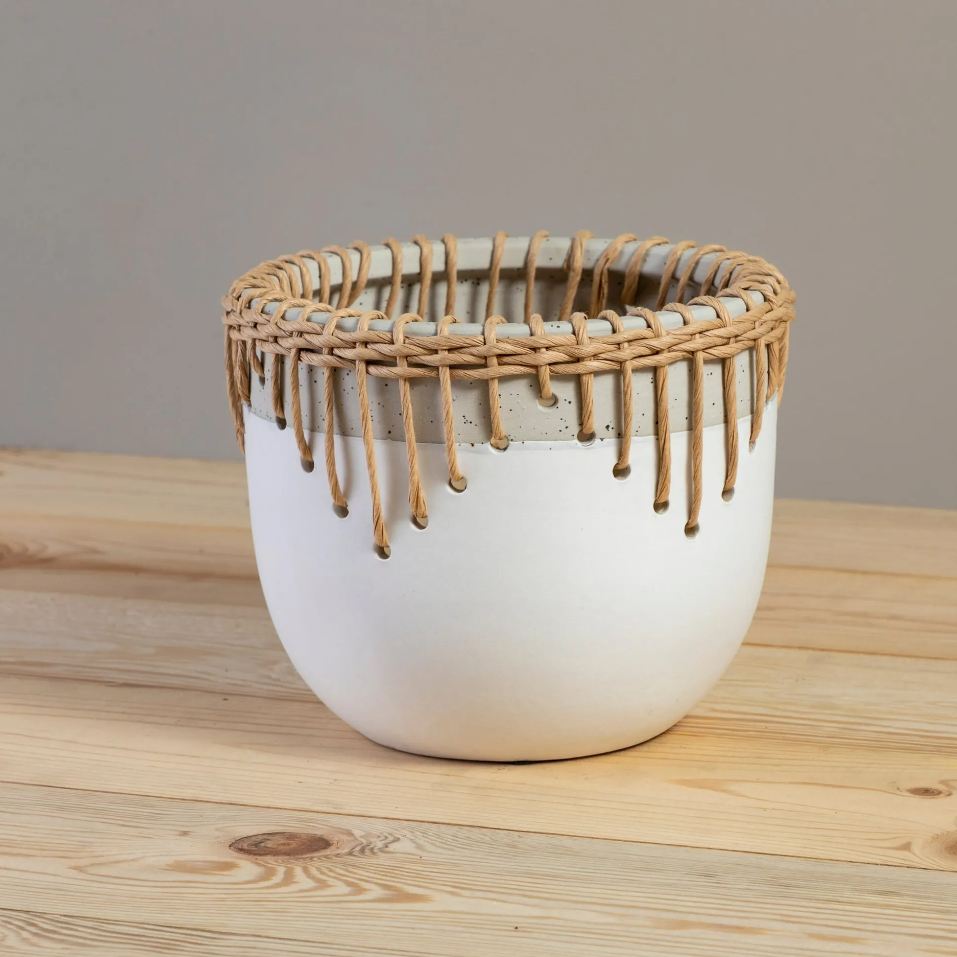 With a two tone neutral base, the Hideaway Pot’s woven rattan detailing around the top and rim feels globally inspired.