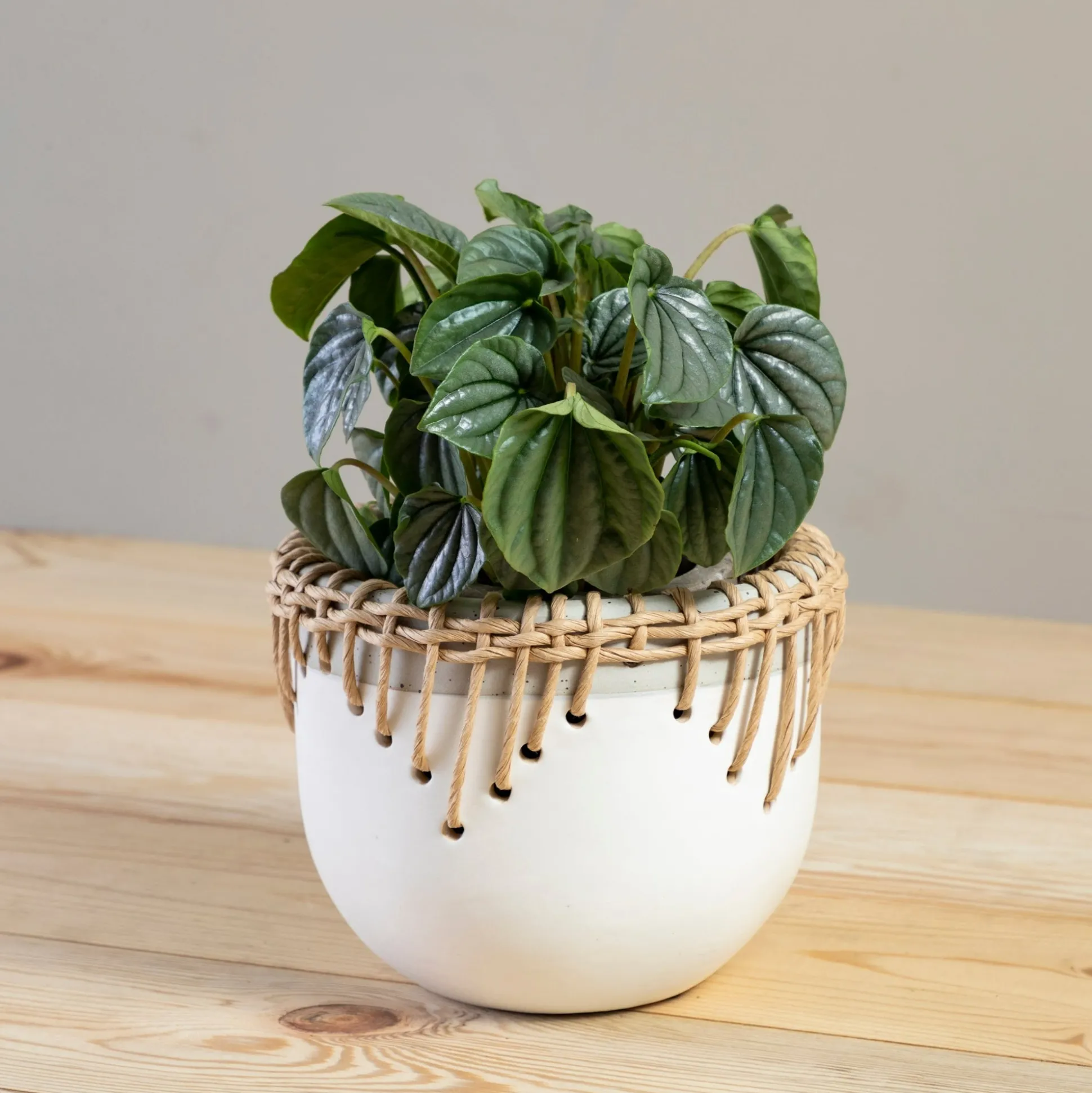 With a two tone neutral base, the Hideaway Pot’s woven rattan detailing around the top and rim feels globally inspired.