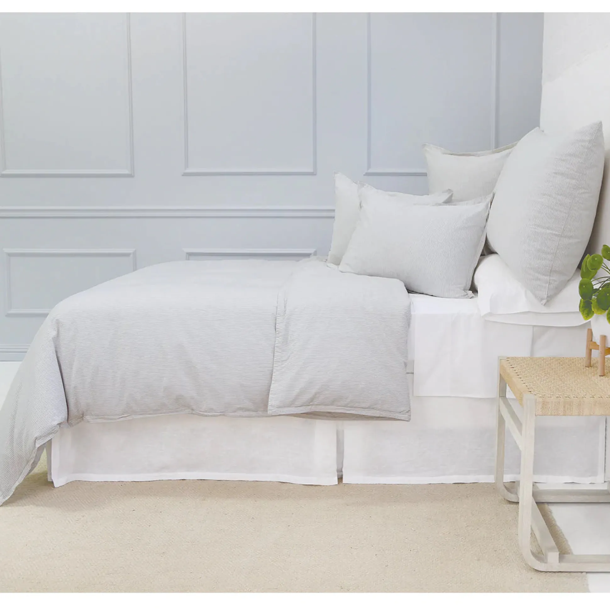 The Luke collection features small gentle stripes on both sides of the crisp cotton. Along with a 1/2 inch finished flange all along the edge of the duvet and shams.