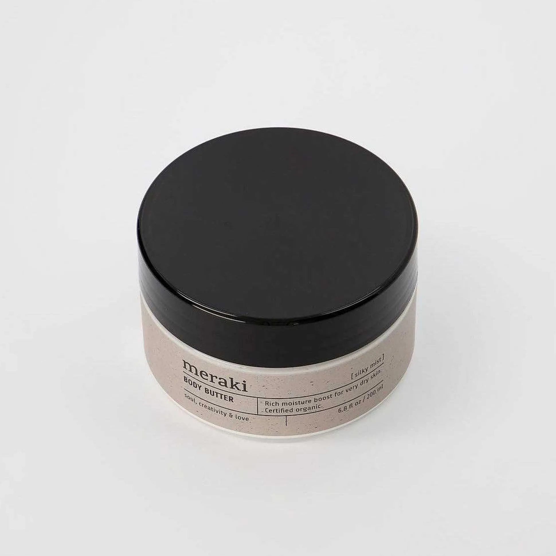 A certified organic and deeply nourishing body butter from Meraki. The silky-smooth moisturizer does not leave a greasy sensation. Rich in organic ingredients such as aloe vera, shea butter, as well as organic oils from almond, sunflower and olive. They all prevent the skin from drying out, leaving it soft and moisturized. Certified organic by ECOCERT Cosmos. Notes of Silky mist: White citrus blossom, different citrusy scents with a sweet touch. Suitable for daily use and for all skin types.
