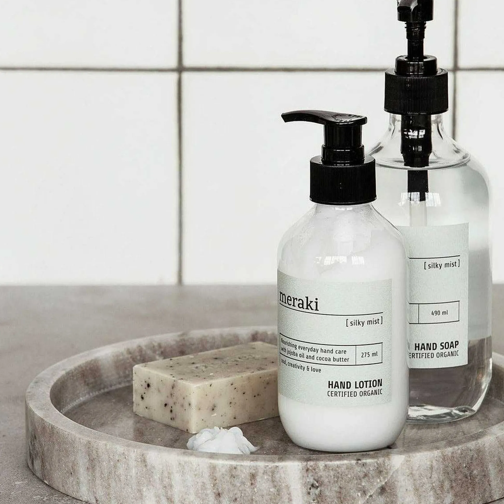 Silky mist is a certified organic hand soap from Meraki. The soap comes in a simple and pure bottle which will add a decorative touch to the bathroom or kitchen. It contains organic aloe vera and extracts of cucumber and apple, which care and moisten the skin. You can place the soap on a little tray in order to create a pure look. This hand soap is suitable for everyday use and for all skin types.
