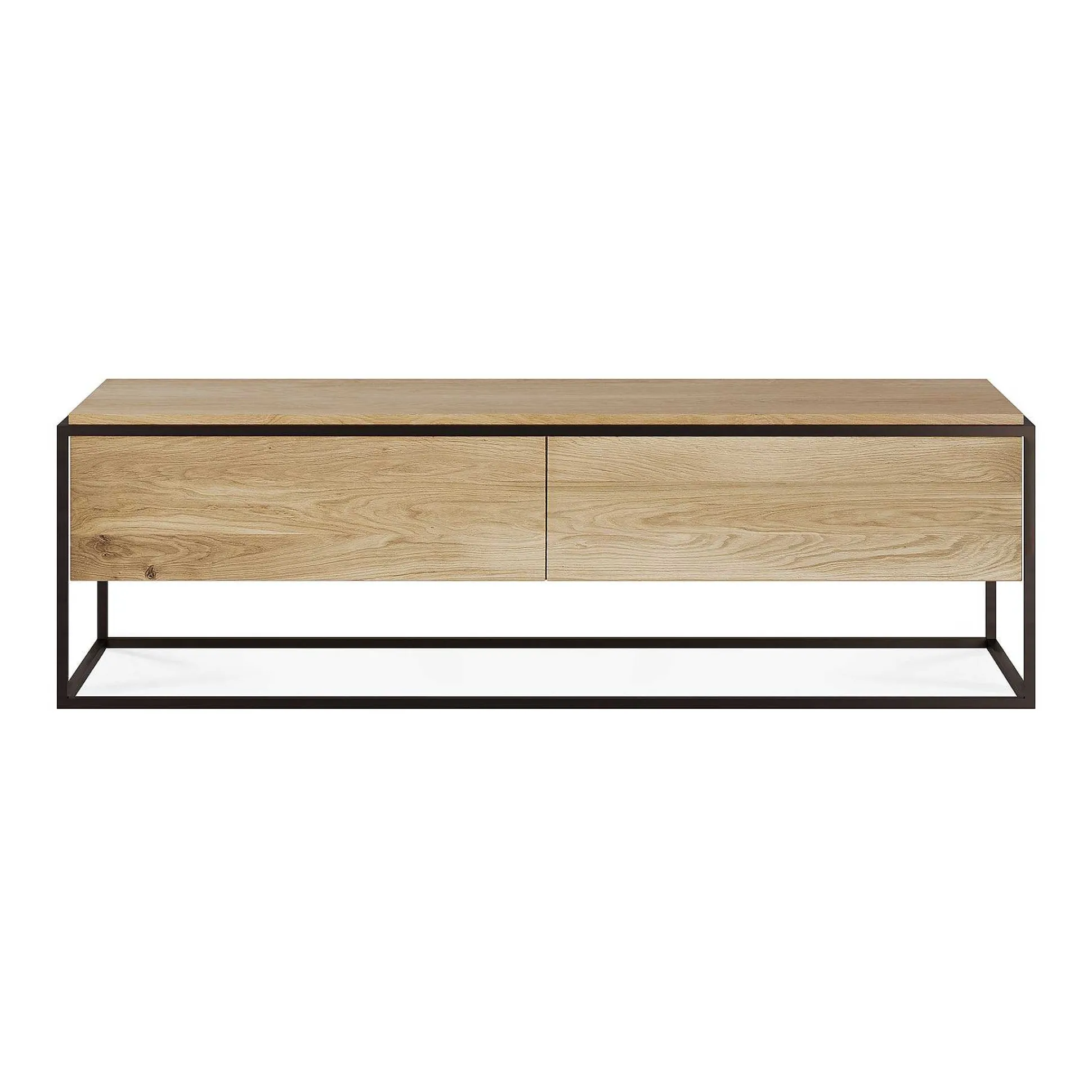 - The Monolit Media Console features 1 push open drawer and 1 flip-down door.