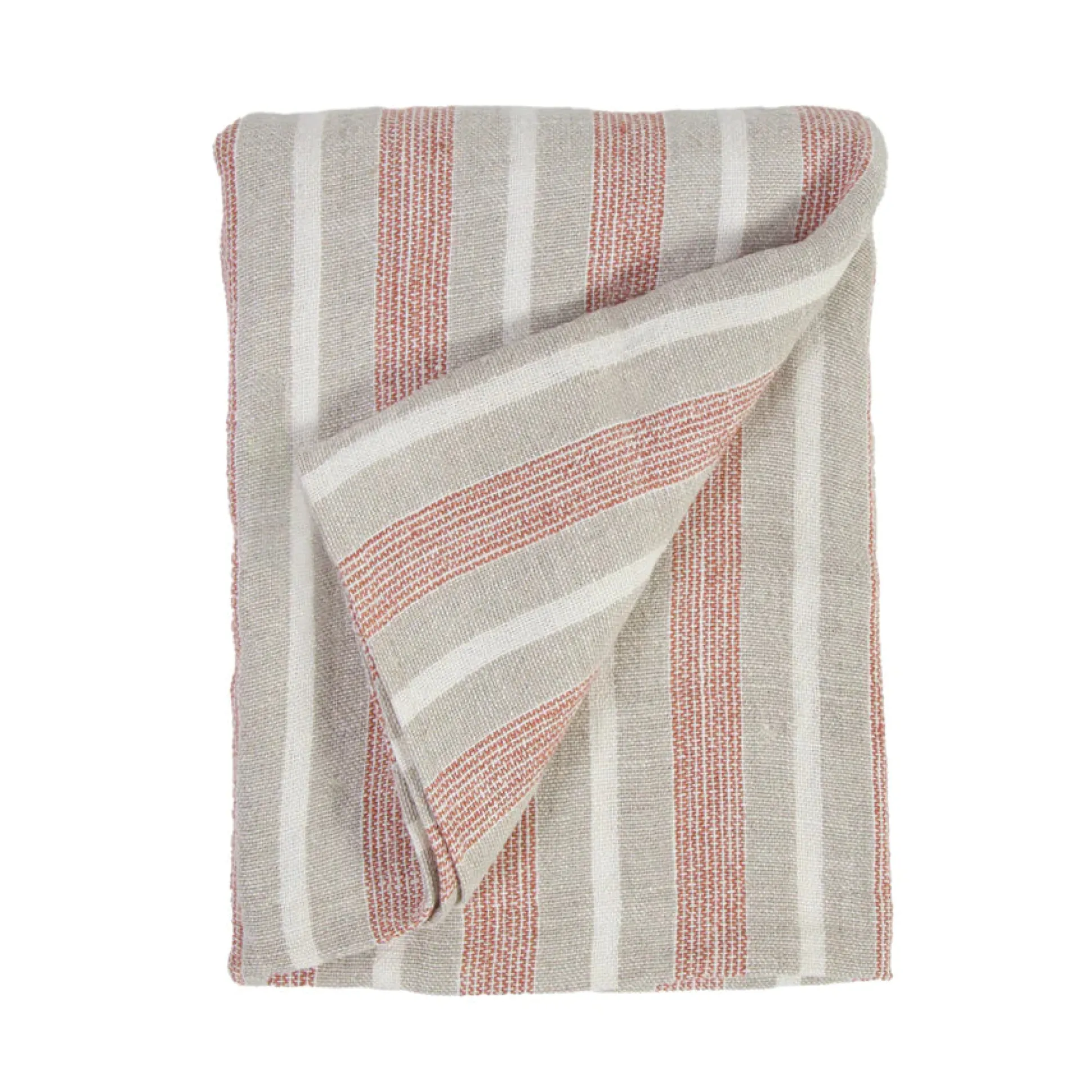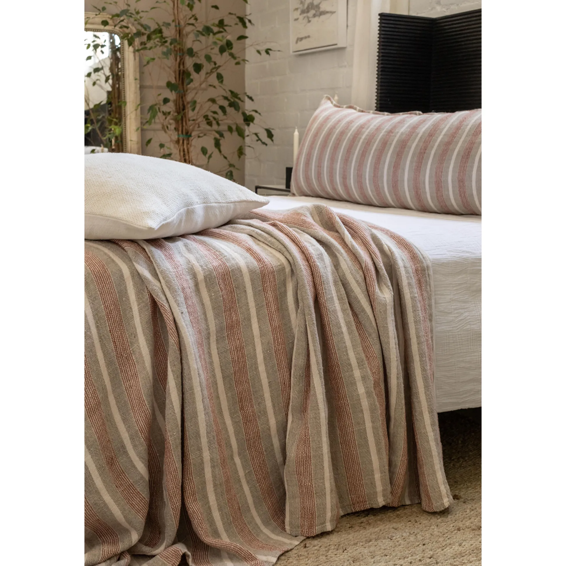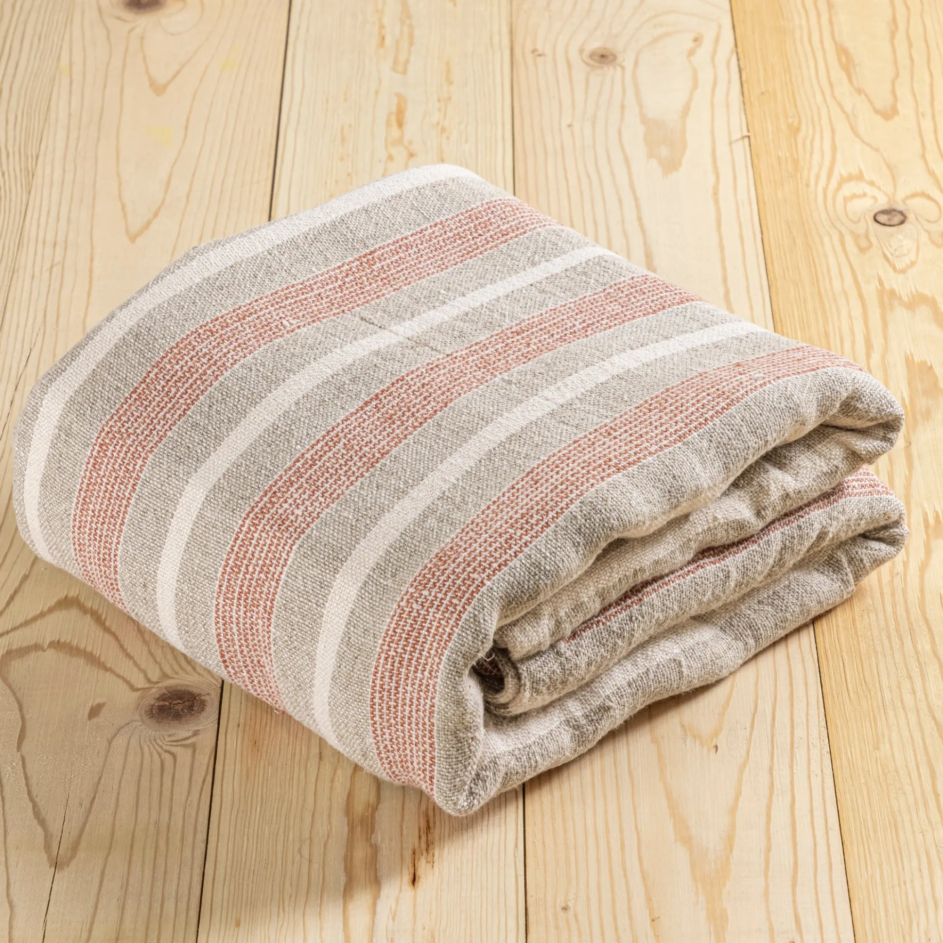 The Montecito collection is a 100% heavy weight hand loomed linen that features alternating thick and thin stripes in a warm color palette of terra cotta and natural surrounded by a 1/2” finished flange.