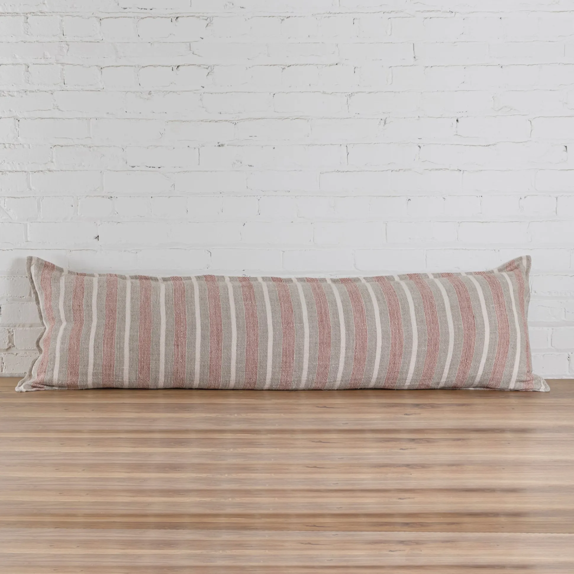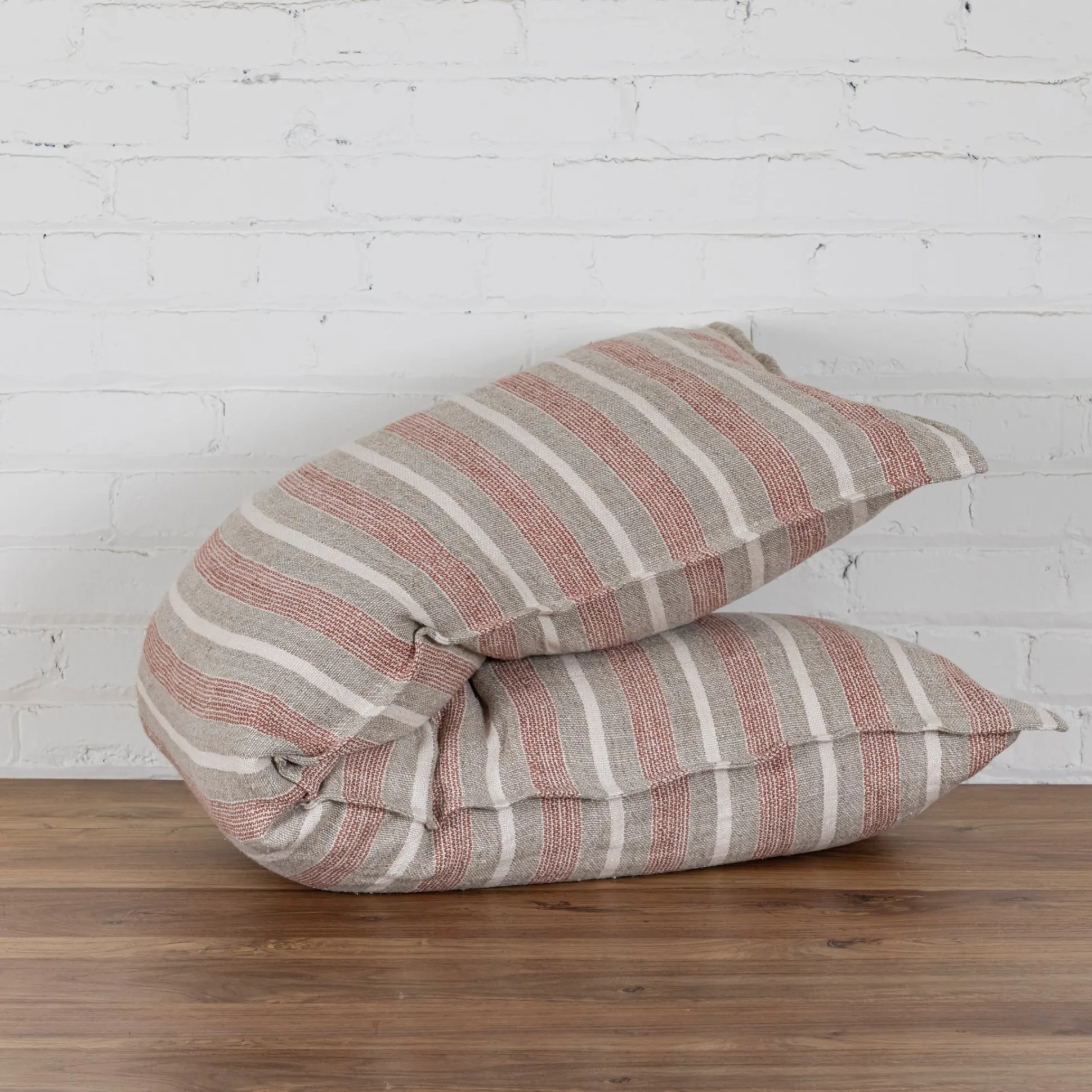 The Montecito collection is a 100% heavy weight hand loomed linen that features alternating thick and thin stripes in a warm color palette of terra cotta and natural surrounded by a 1/2” finished flange.