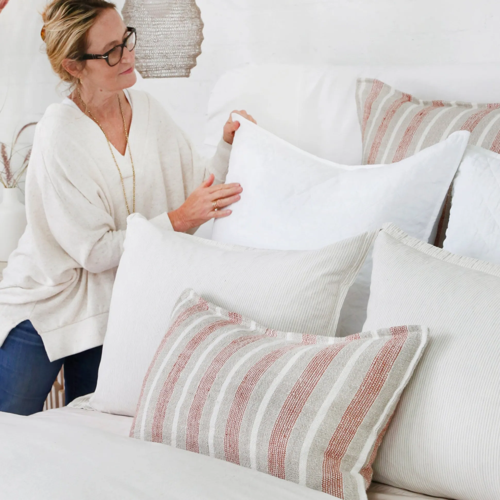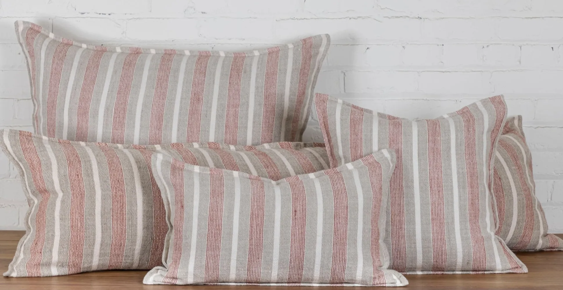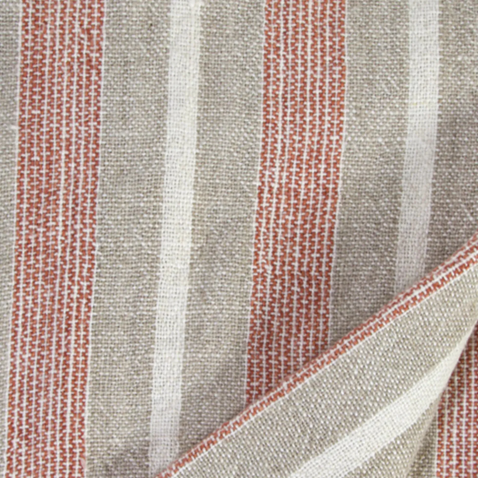 The Montecito collection is a 100% heavy weight hand loomed linen that features alternating thick and thin stripes in a warm color palette of terra cotta and natural surrounded by a 1/2” finished flange.