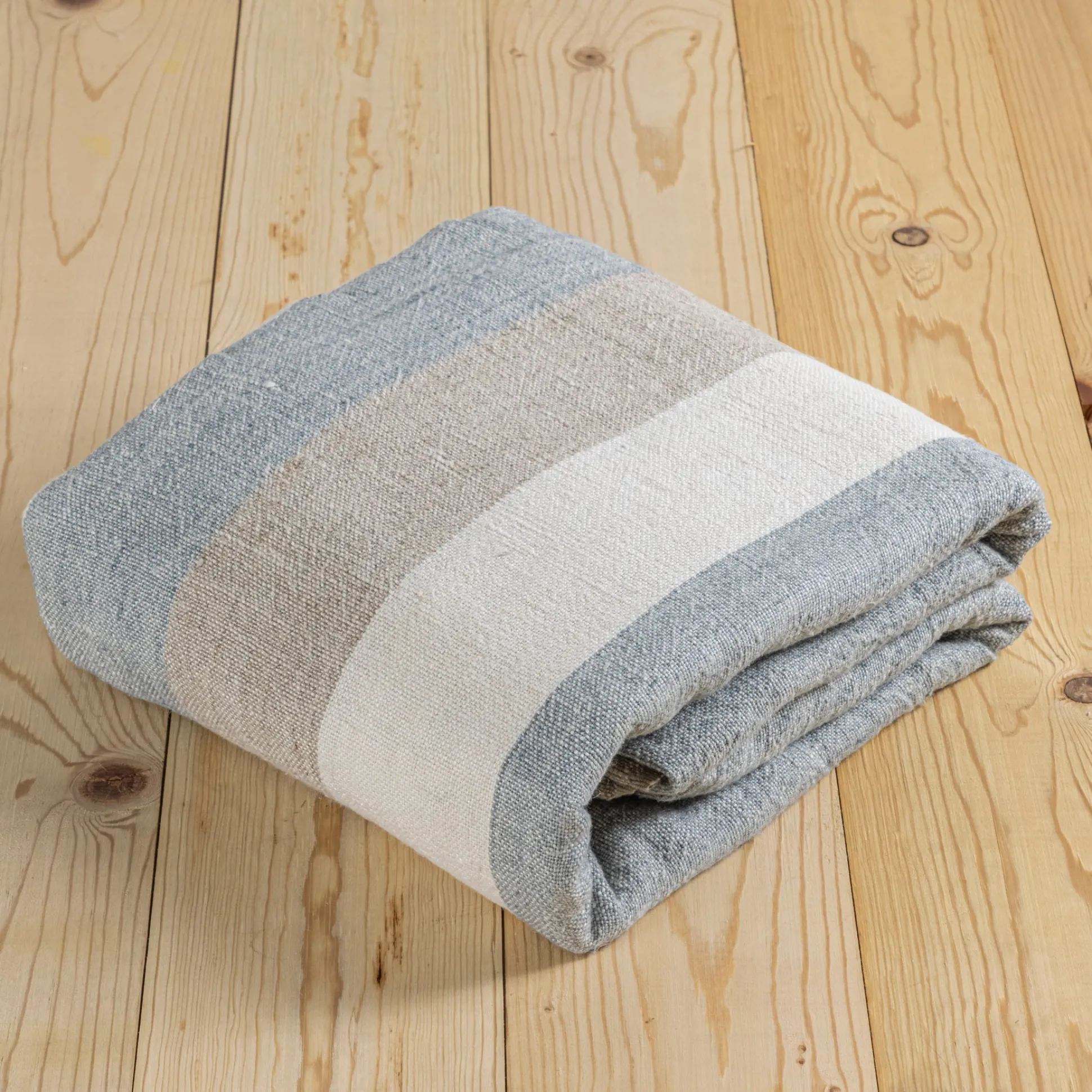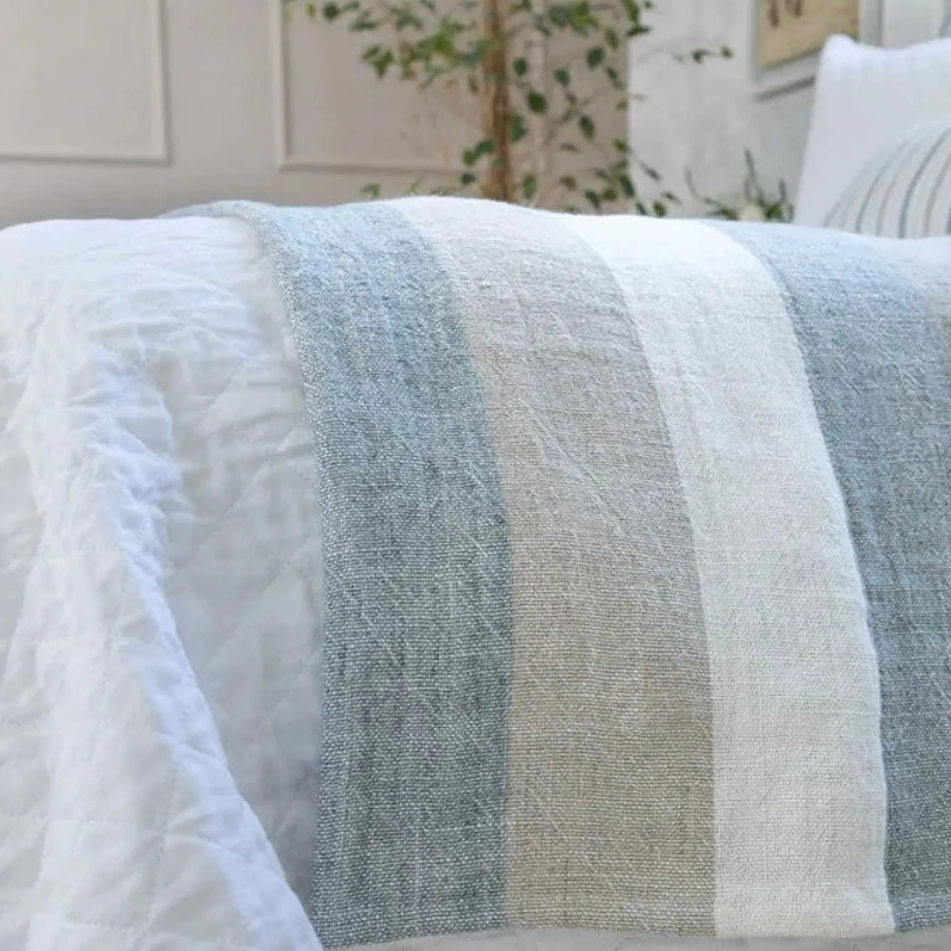 The Monterey collection is a 100% hand-loomed, heavy weight linen that features a 1/2″ flange and broad coastal stripes.