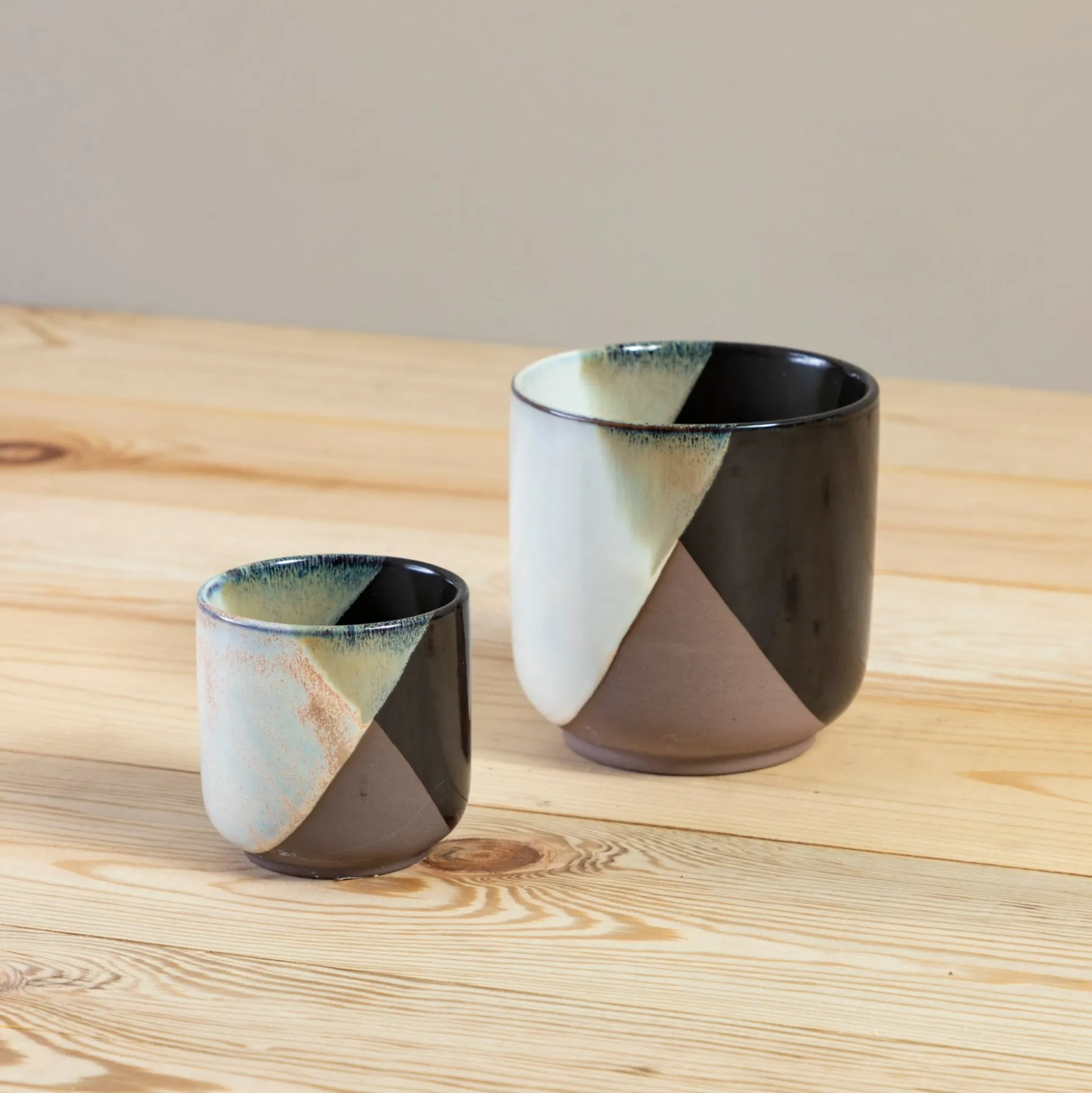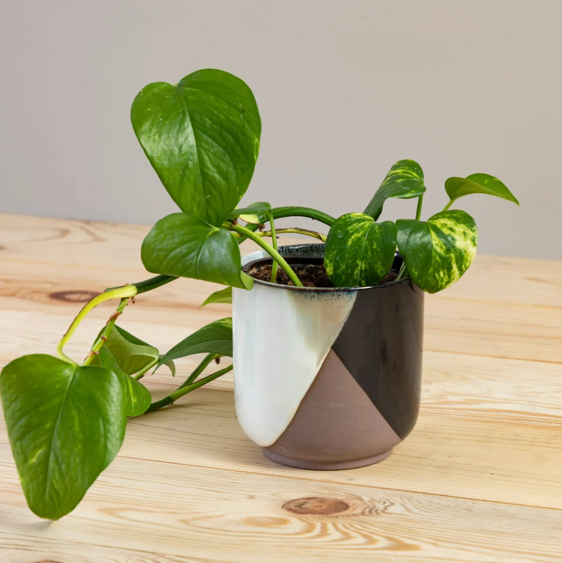 The unique finish of the Retro Pot is crafted from black clay with white and black glaze in a geometric pattern for a modern look.