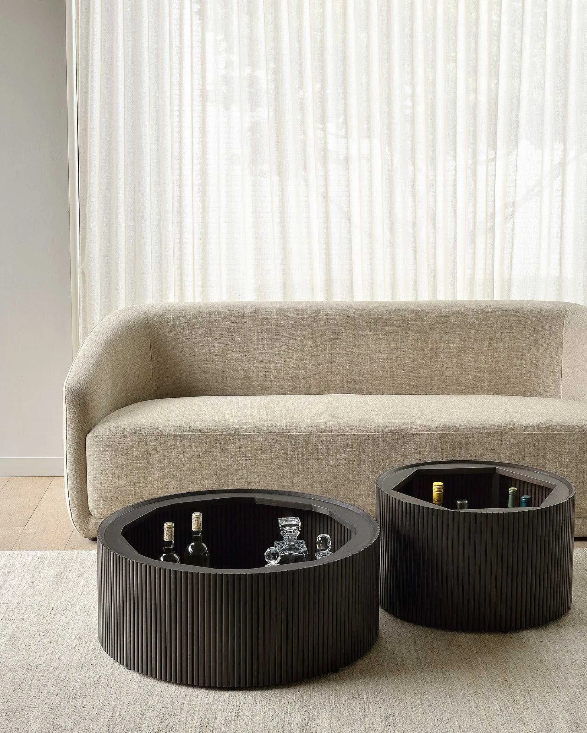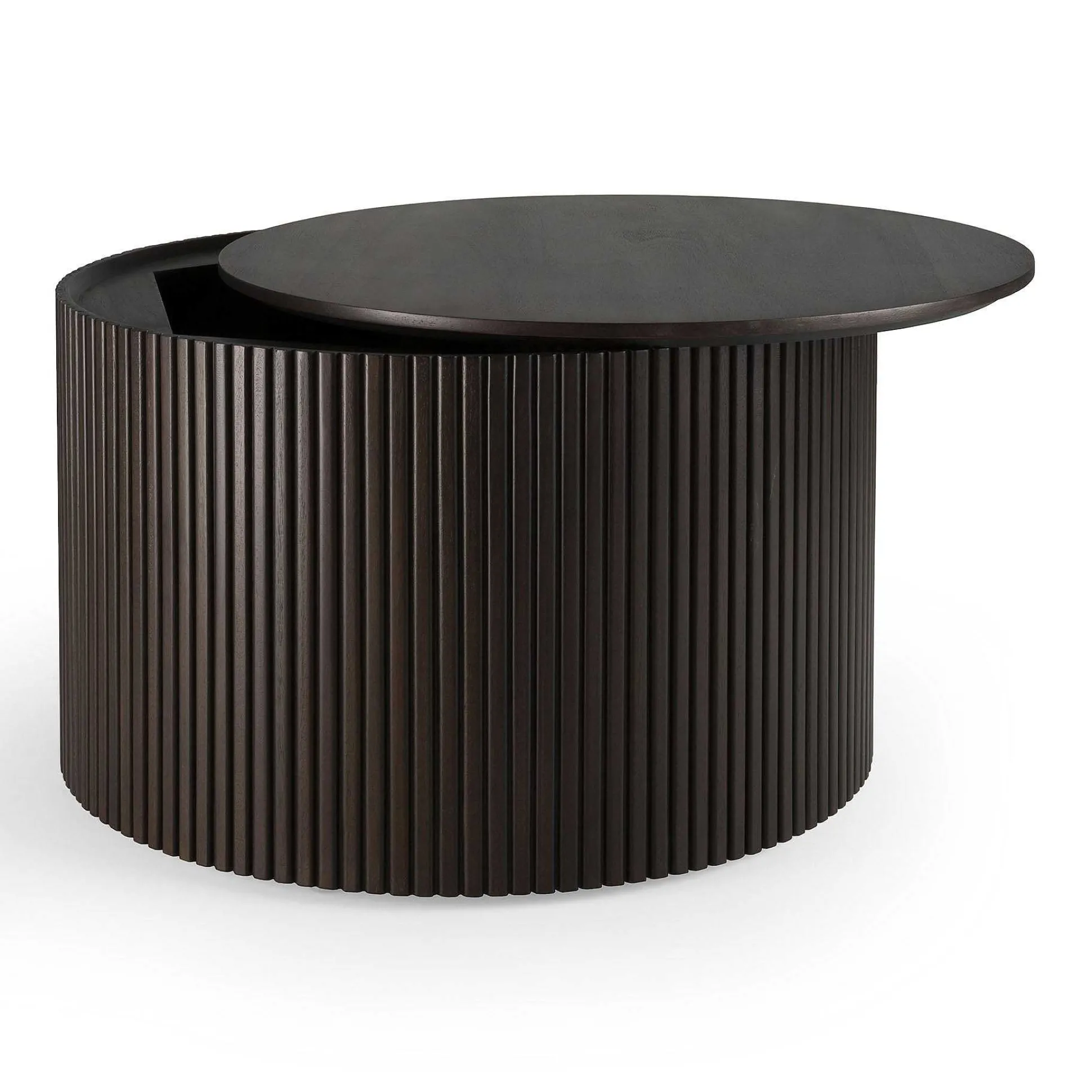 The Roller Max is a clever multifunctional item that combines a coffee table with storage. Encapsulated in its stacked wood-stick effect, the tabletop can be easily removed to hide toys, cushions, and throws from daily life. The perfect solution for smaller living.