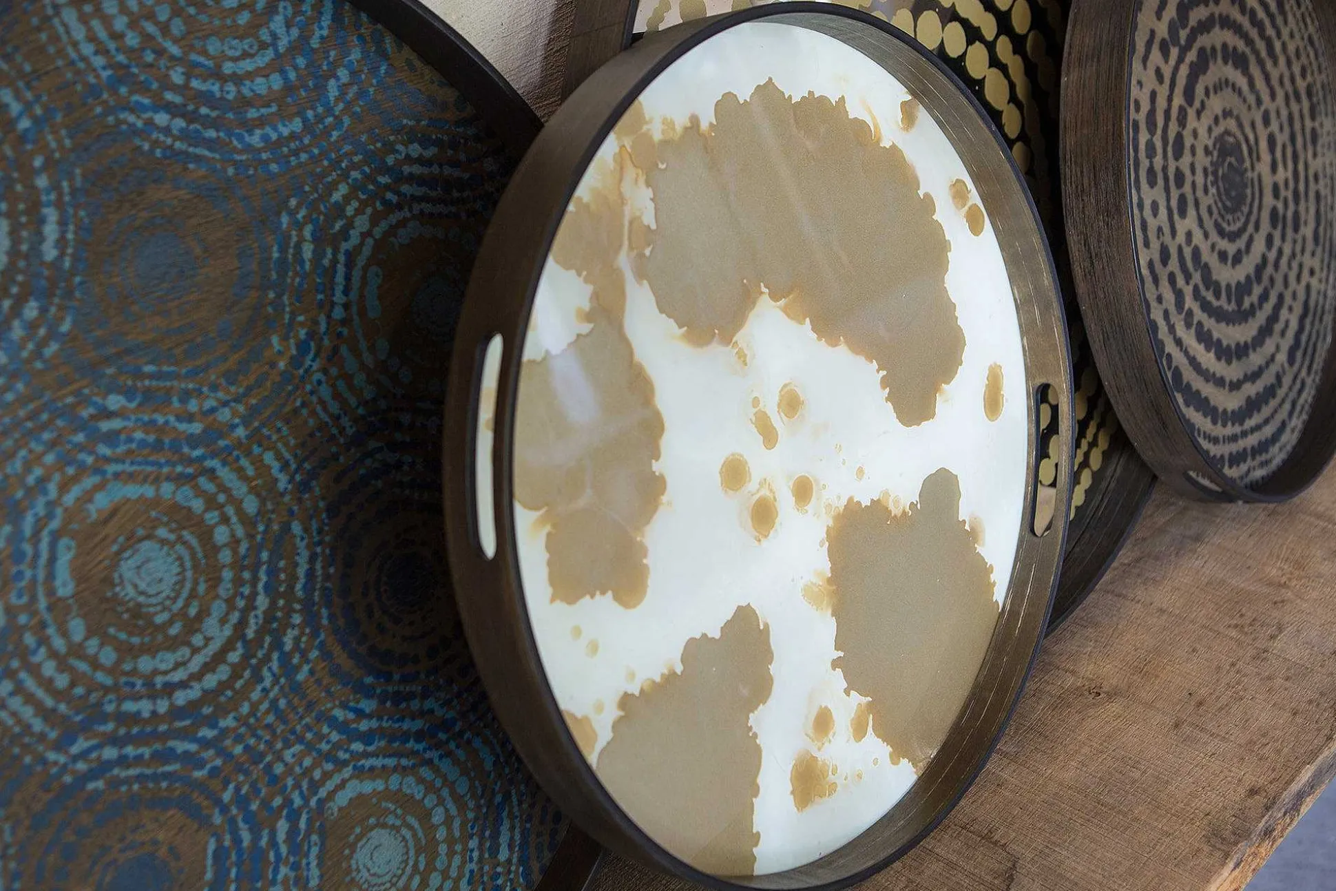 Distinctive and luxurious, the Mystic Gold collection of trays instantly lights up a space with its sunny colors, modern patterns and invigorating bursts of gold. The contrast between its dark wooden rims and bright glass bases further highlights the exquisite tints of gold that are prevalent throughout the collection.
