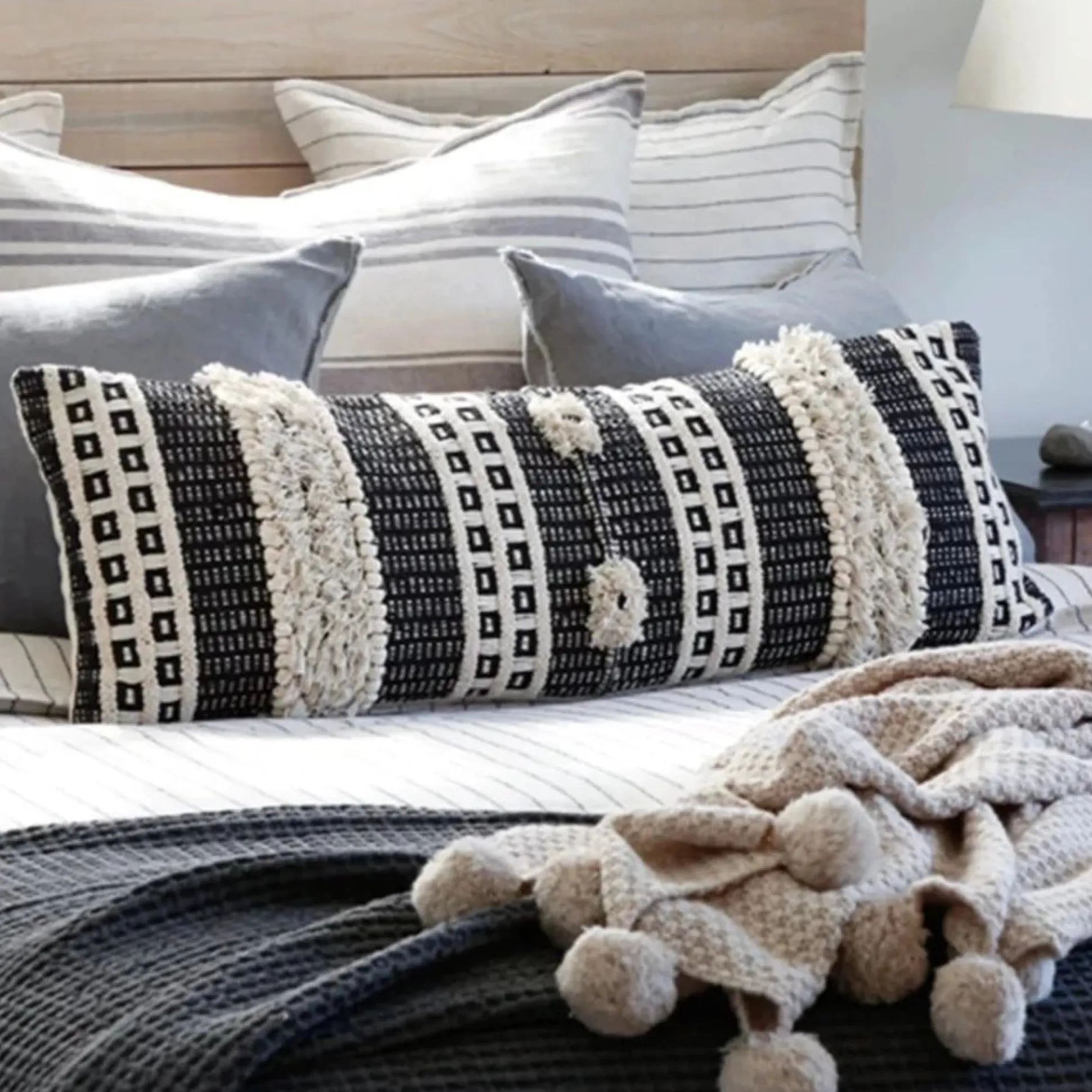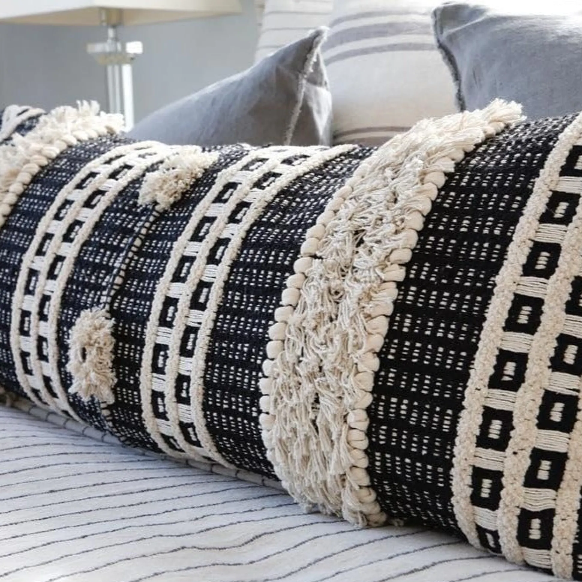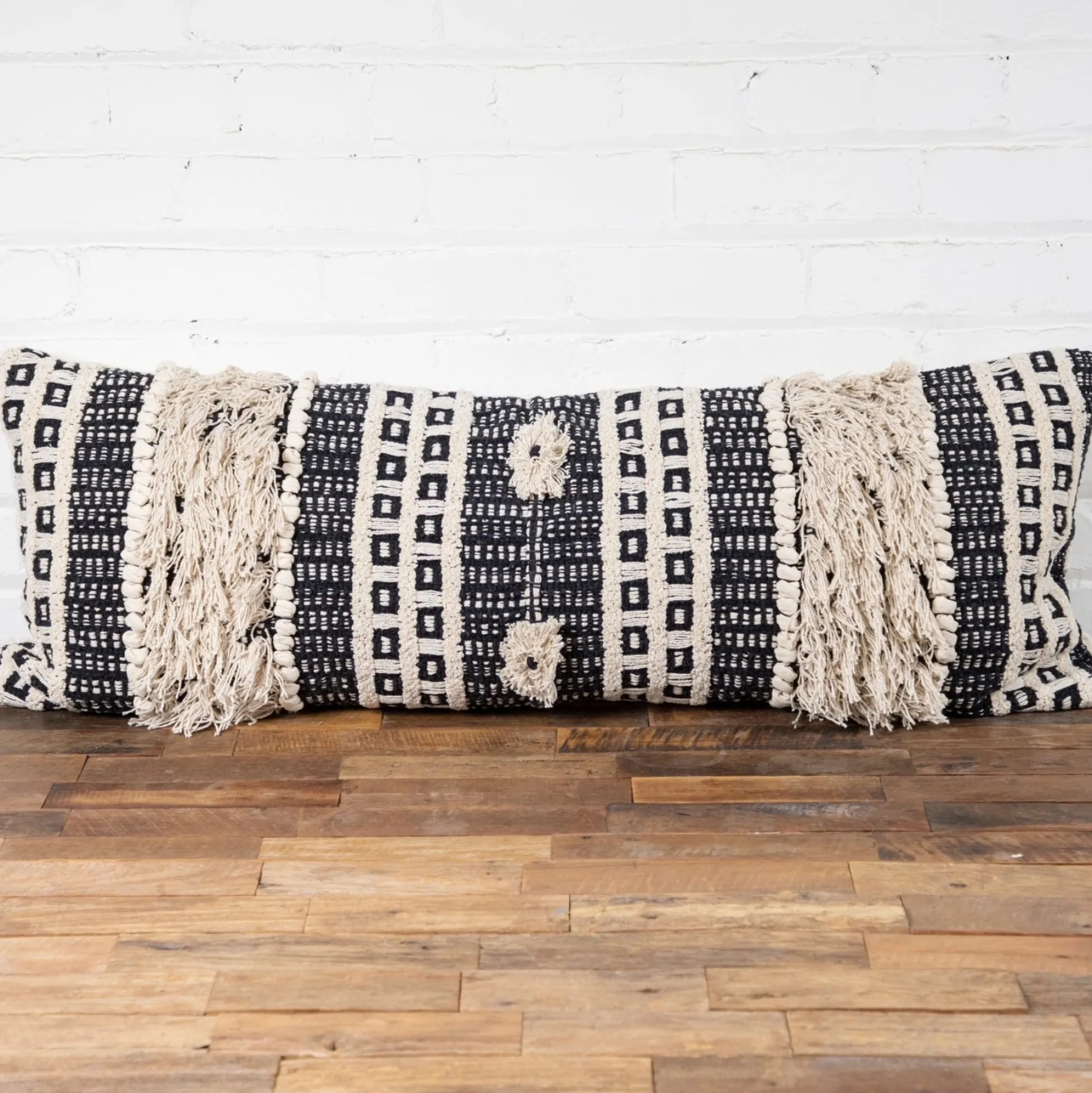 The Sawyer pillow is handwoven cotton with alternating stripes of tassels, knots, pom poms, and geometric design.