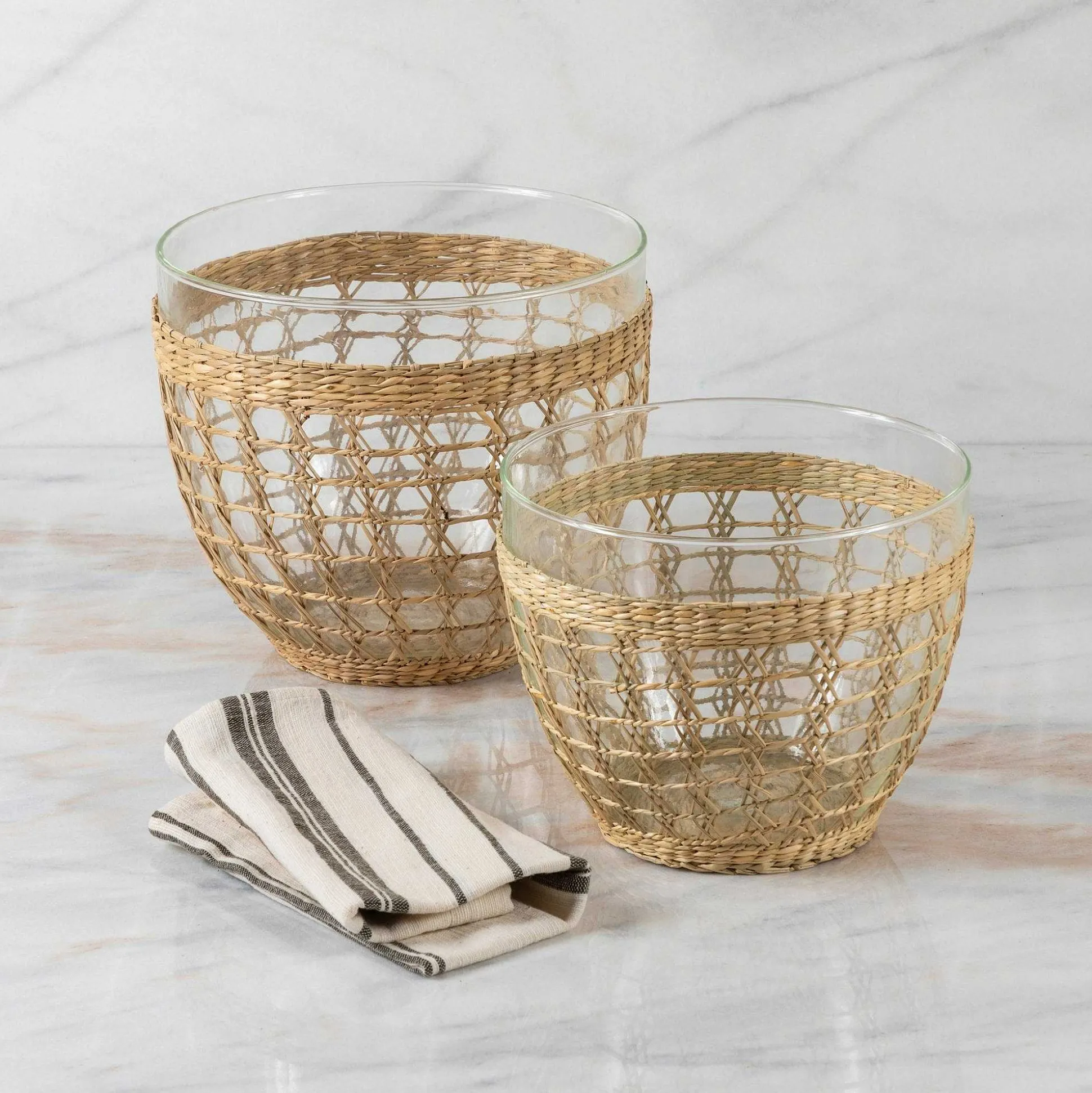 Seagrass meets glassware in this collection, which is an update on an old favorite. Natural wraps on pitchers and matching glassware make festive pieces for indoor and outdoor drinking and dining.
