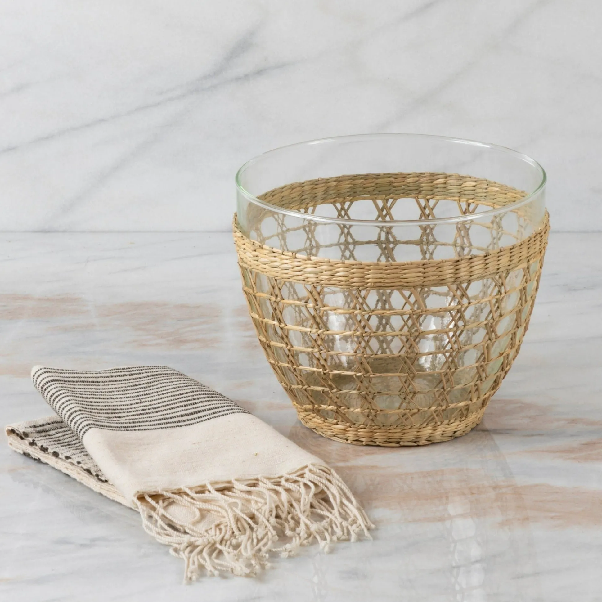 Seagrass meets glassware in this collection, which is an update on an old favorite. Natural wraps on pitchers and matching glassware make festive pieces for indoor and outdoor drinking and dining.