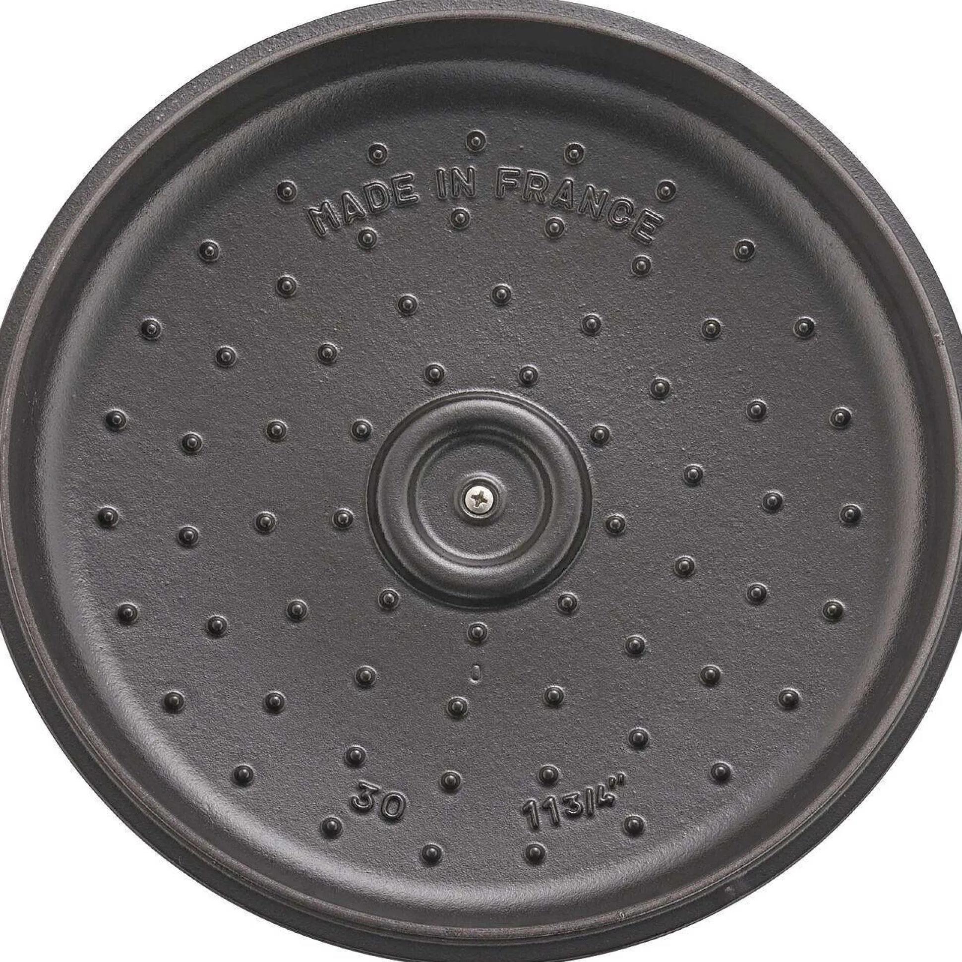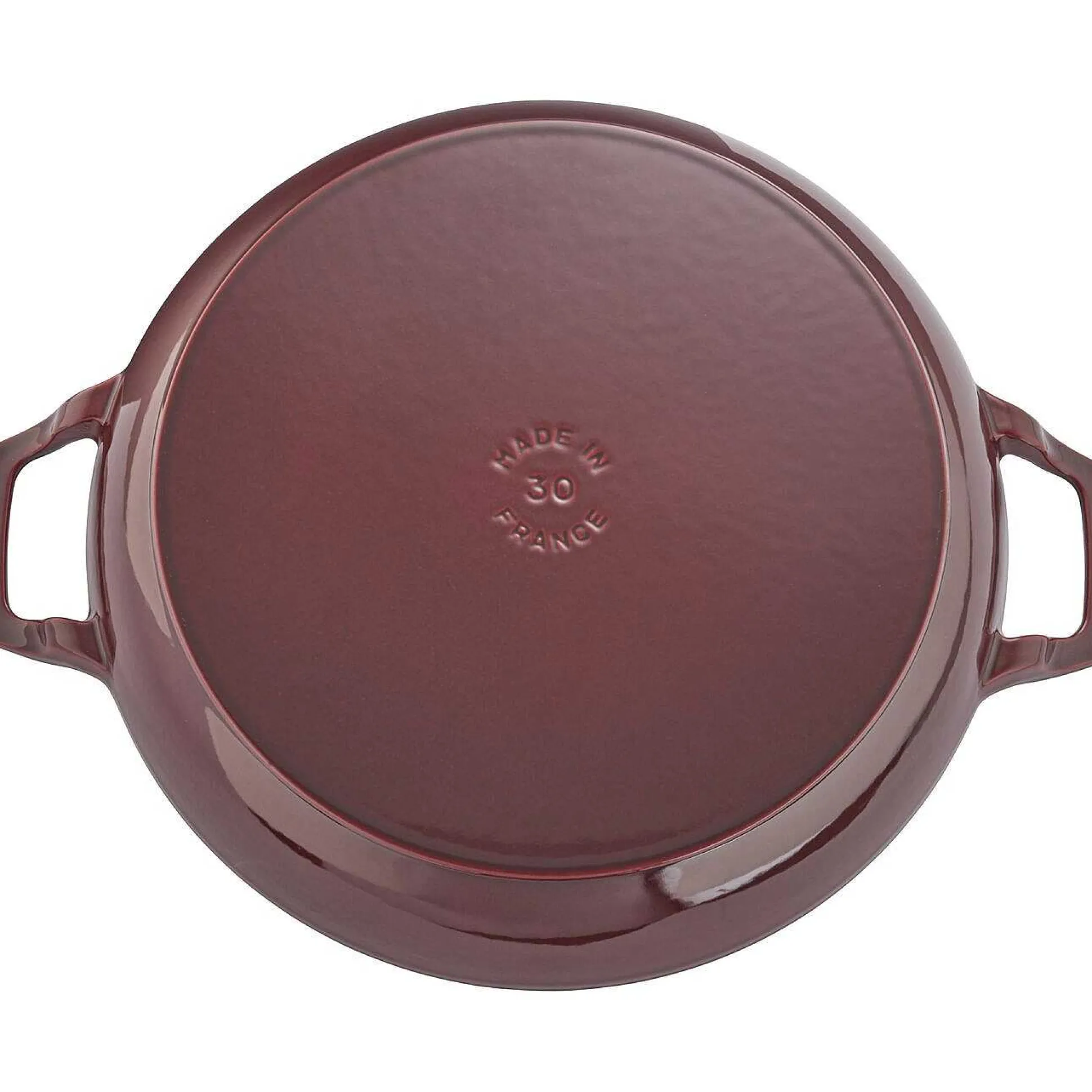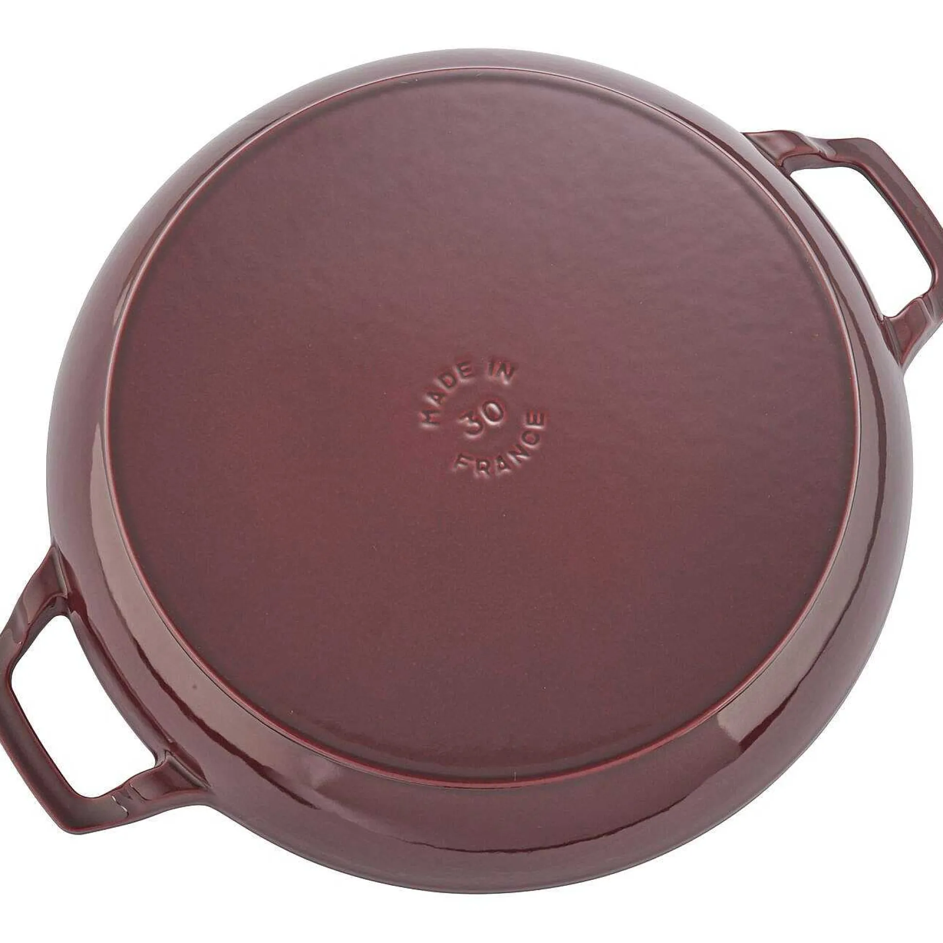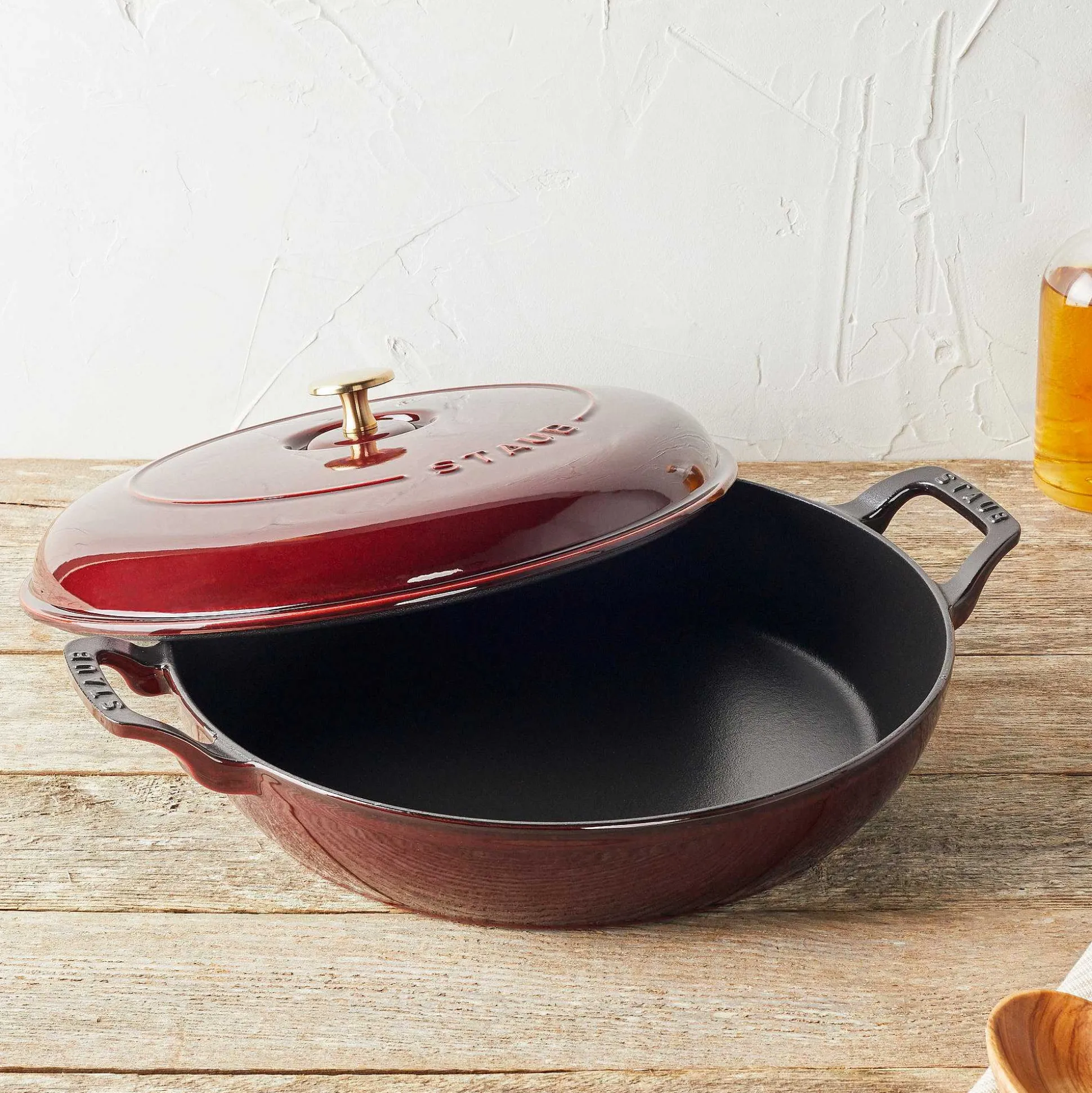 The Staub Cast Iron 3.5-qt Braiser is the perfect pot for one-dish suppers, braised lamb shanks, and breakfast hash. It will quickly become your go-to cooking vessel, perfect for sauteing, frying, braising, and roasting. Thanks to its vivid Majolica enameling – a three-step technique that imbues the color with brilliance and depth – this iconic piece beautifully transitions from oven to table.The domed lid makes it easy to cook large cuts of meat – its heavy weight helps lock in moisture for flavor-enhanced food. The braiser’s unique design features vintage look handles that encourage easy maneuvering while wearing oven mitts.