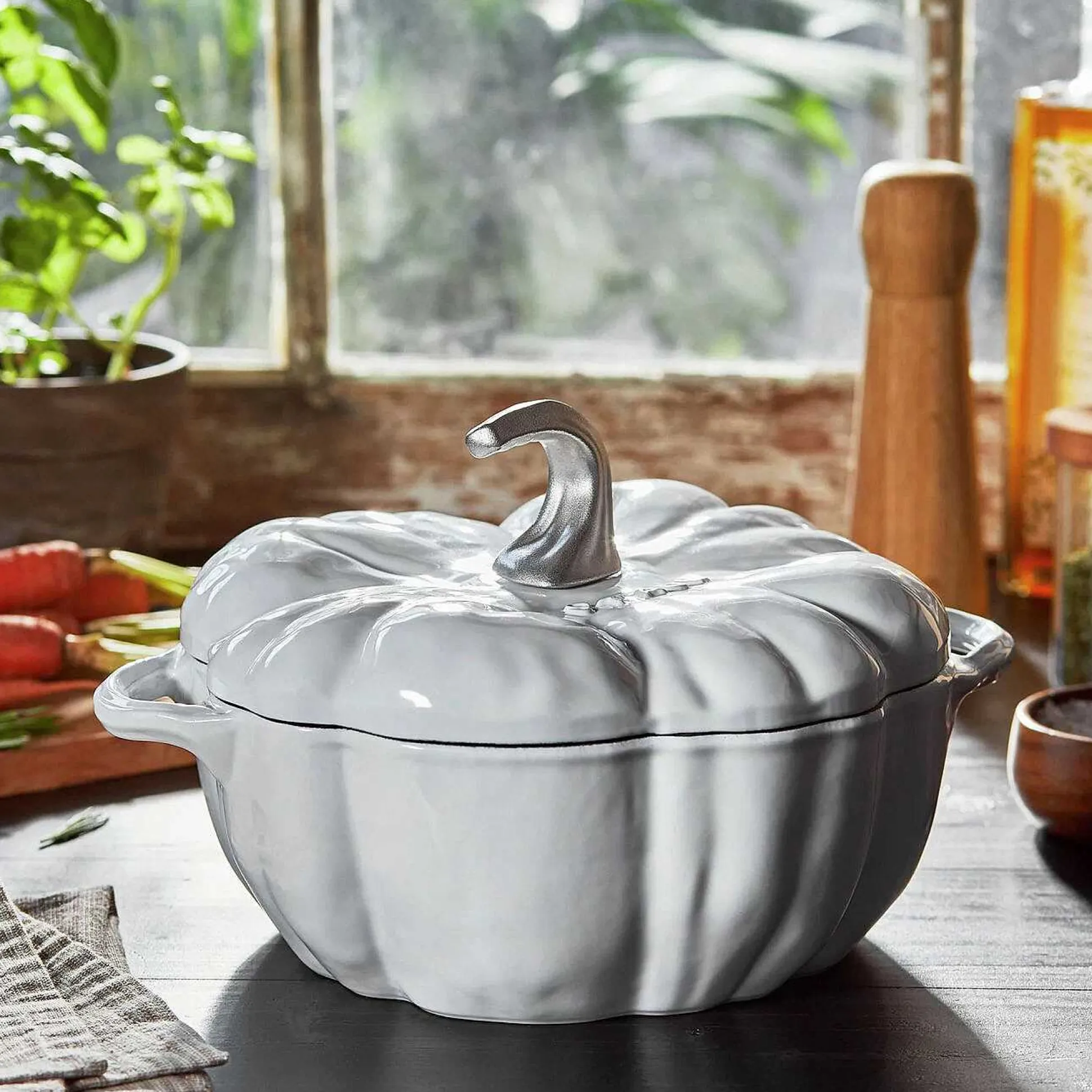 Welcome fall with these pumpkin-shaped cast iron Dutch ovens. Cook cold-weather soups and casseroles, serve hot dips and savory spreads, or bake pumpkin bread in this versatile pot. With their gorgeous enamel finish and intricate pumpkin design, these cocottes are an elegant yet whimsical addition to your autumn entertaining table.