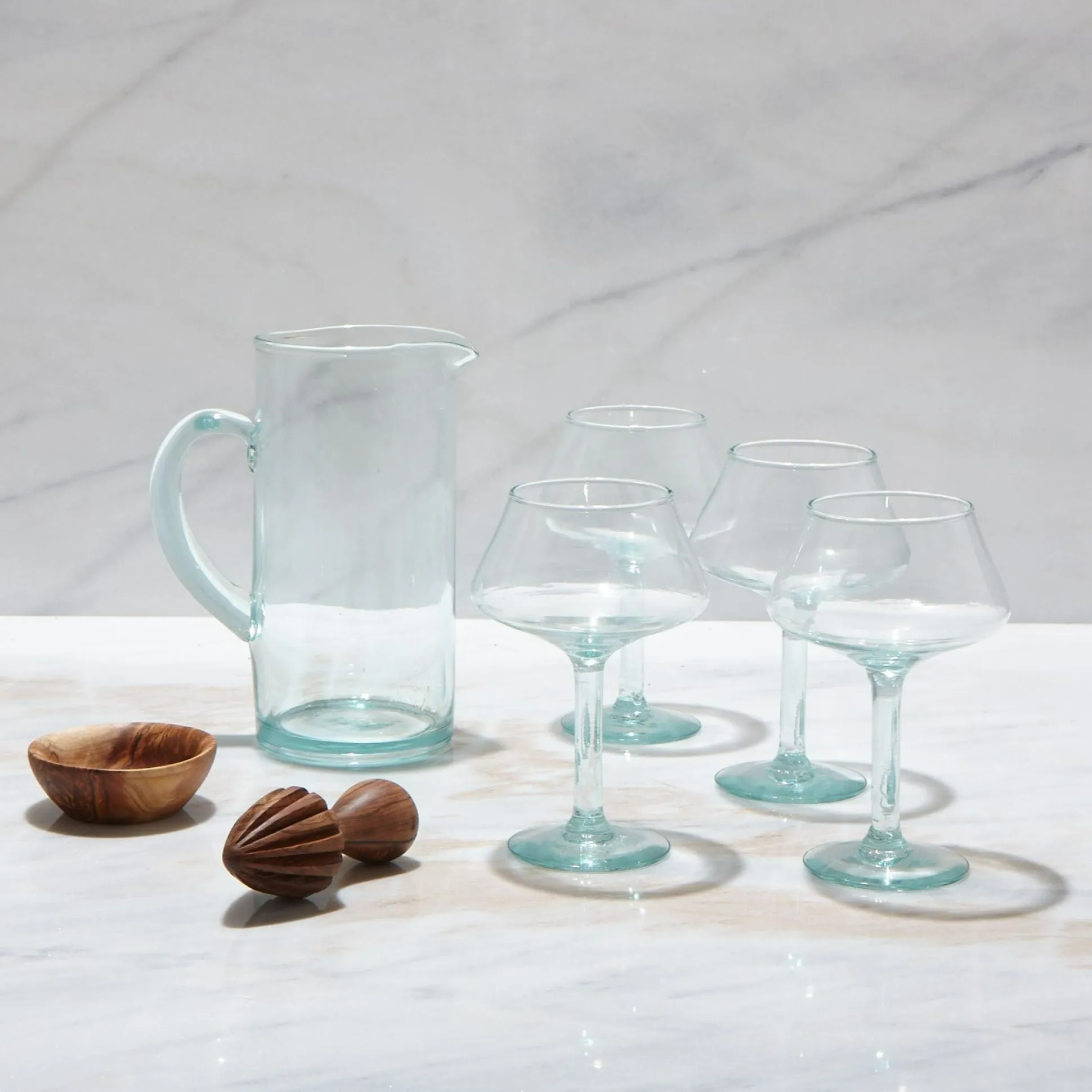 Bundle Includes: Premium Recycled Margarita Glass, Set of 4, Premium Recycled Glass Modern Pitcher, Olive Wood Citrus Press, Olive Wood Pinch Bowl