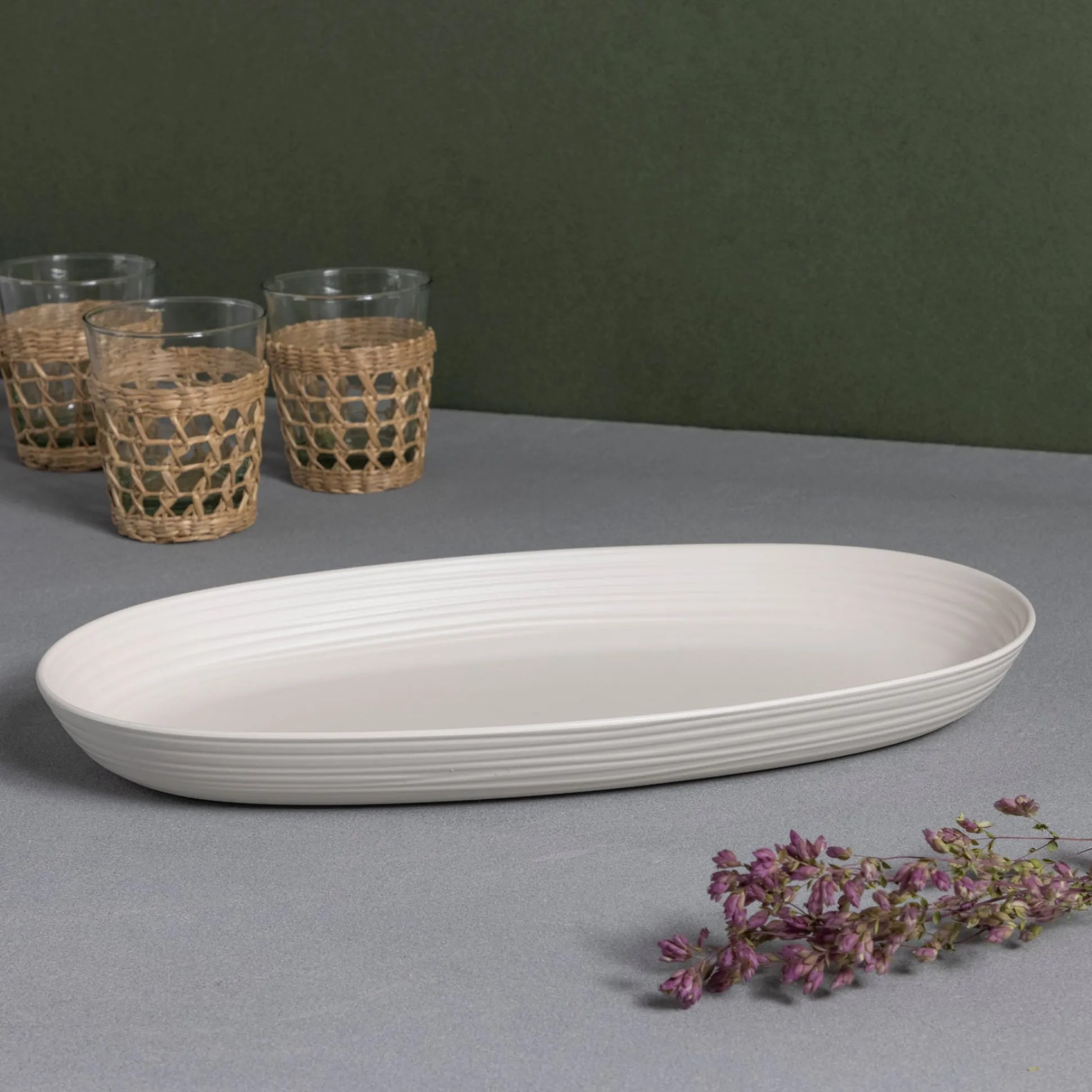Tierra collection serving tray, made entirely by recycling 13,5 post-consumer PET water bottles, symbolizing a revolution in terms of material and style. The intentionally uneven circular decorations confer a strikingly resonant hand-made look.